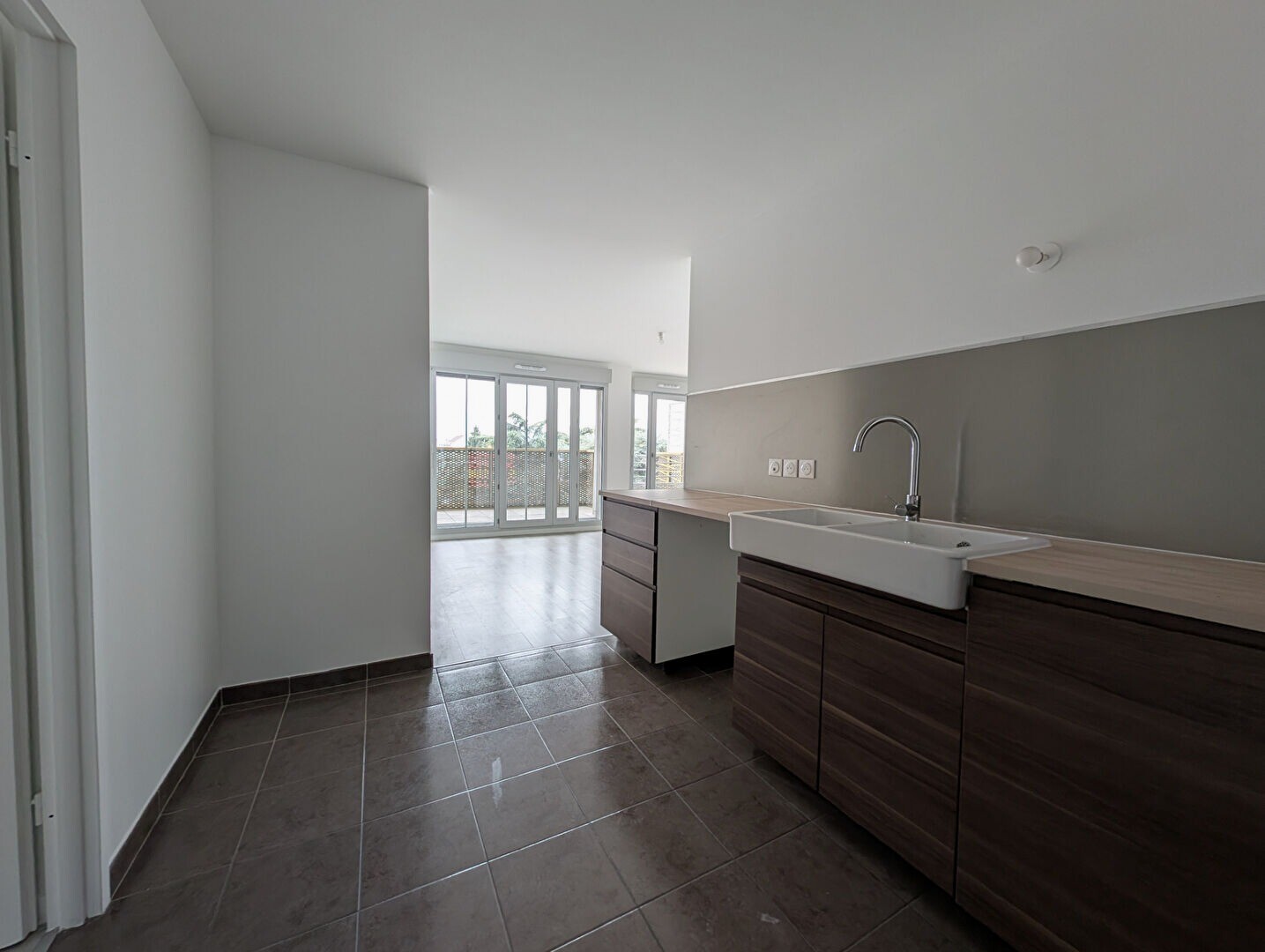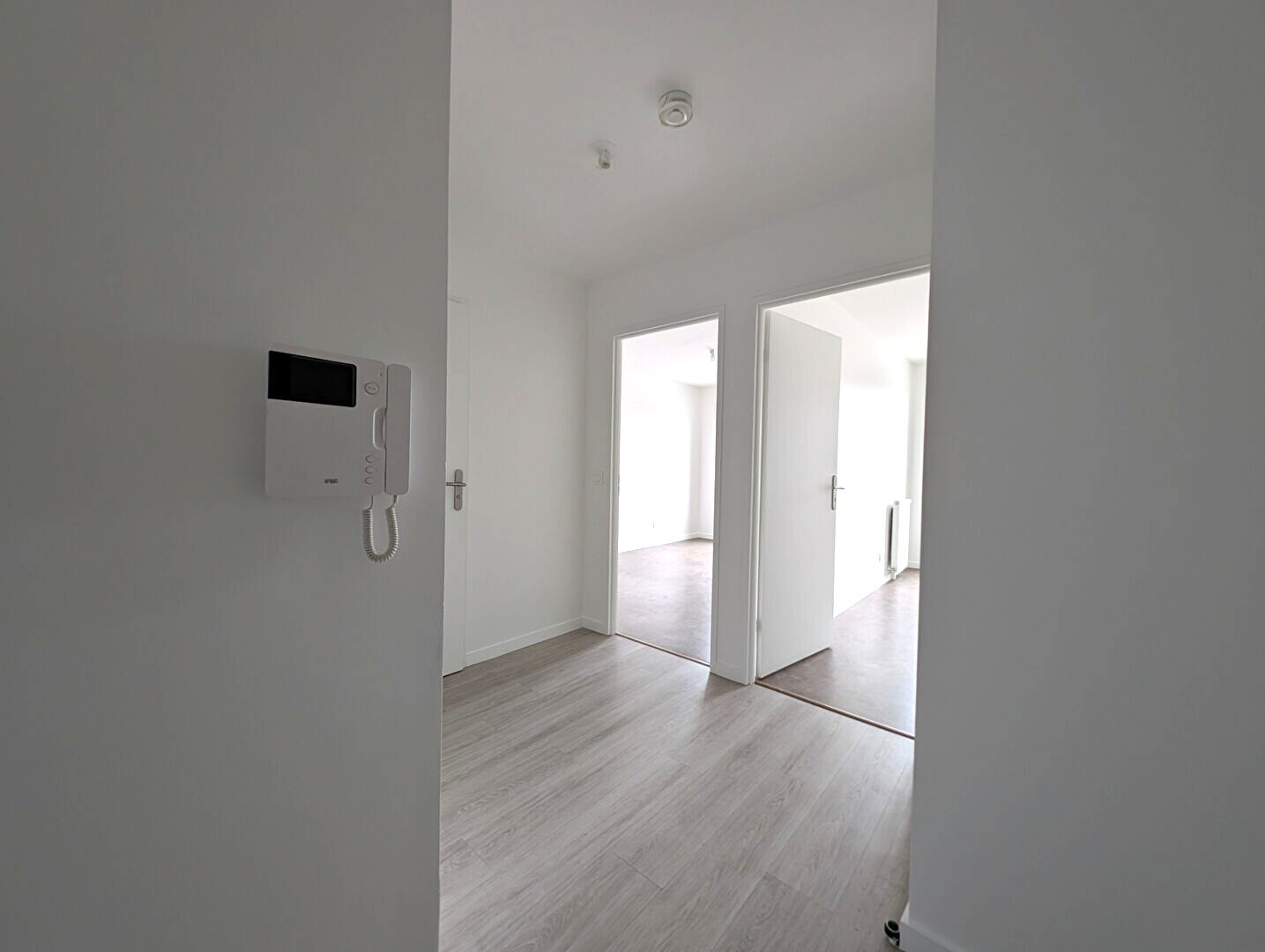 Entrée avec placard, séjour, cuisine ouverte aménagée, balcon, 2 chambres, salle de bains et WC séparés.