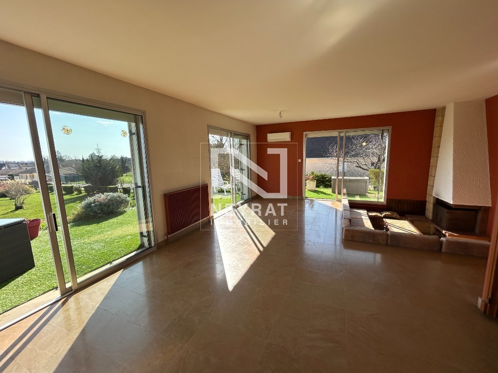 L'espace de vie se compose d'un grand séjour et d'un salon en contrebas doté d'une cheminée, qui apportent une atmosphère chaleureuse et lumineuse.