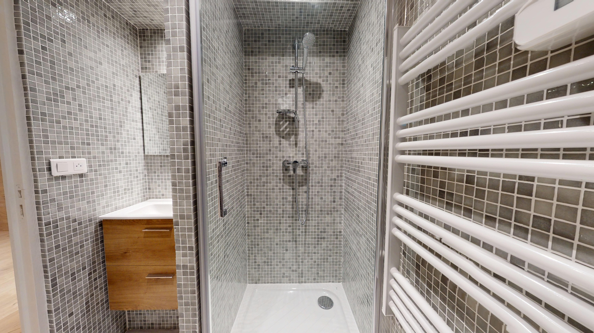 Séjour ouvert sur cuisine équipée, trois chambres, deux salles d'eau, deux WC dont 1 séparé.