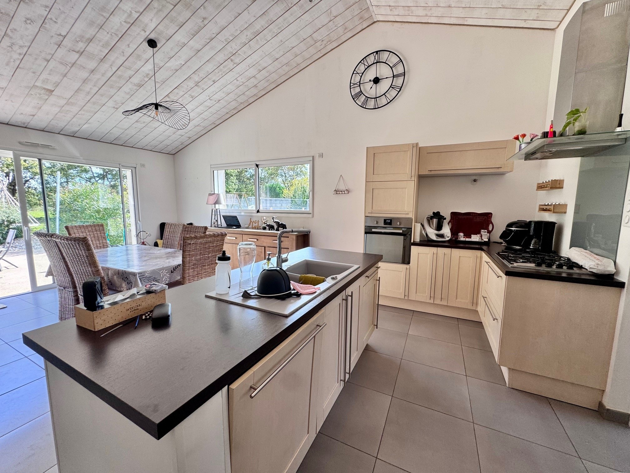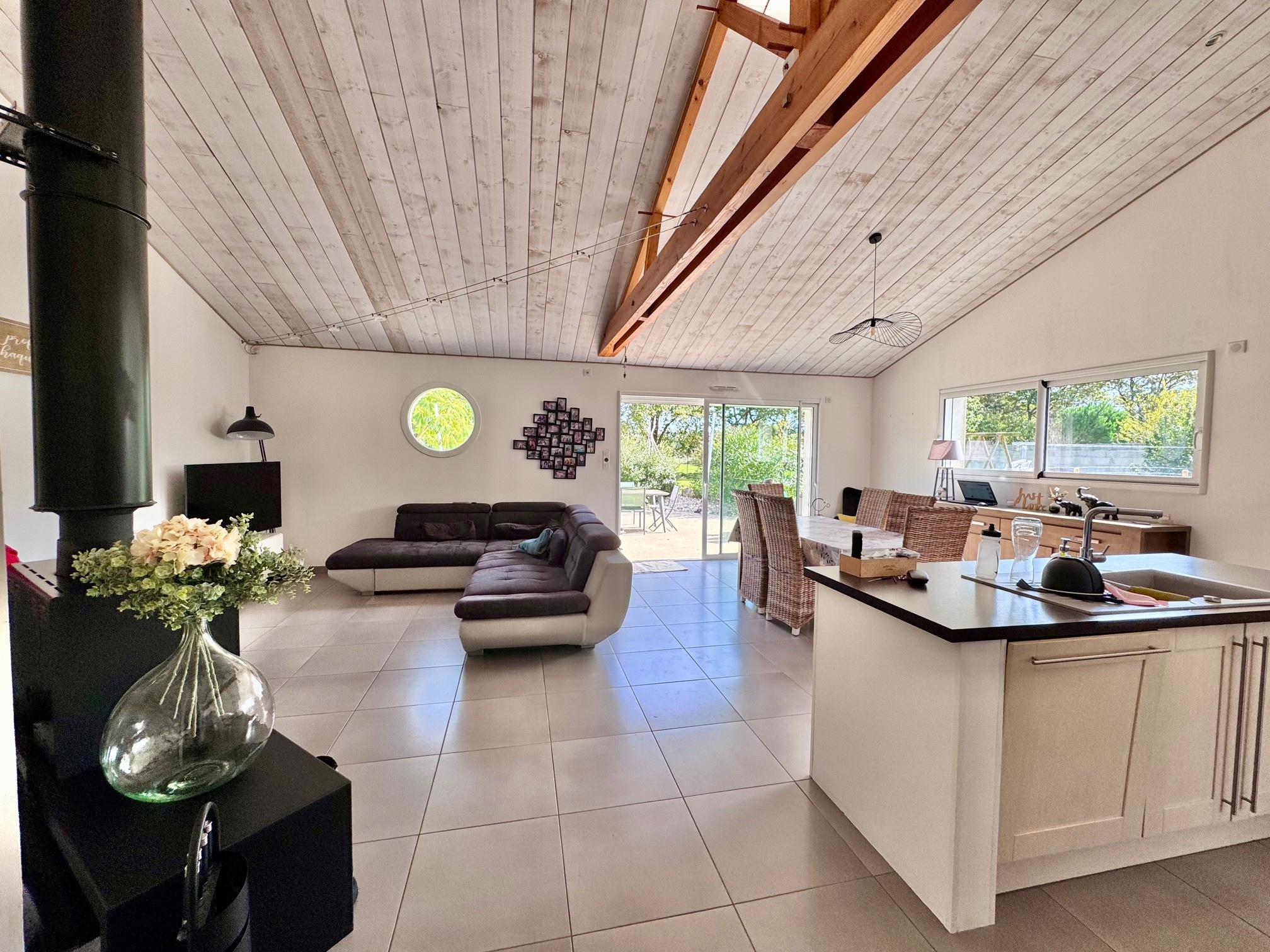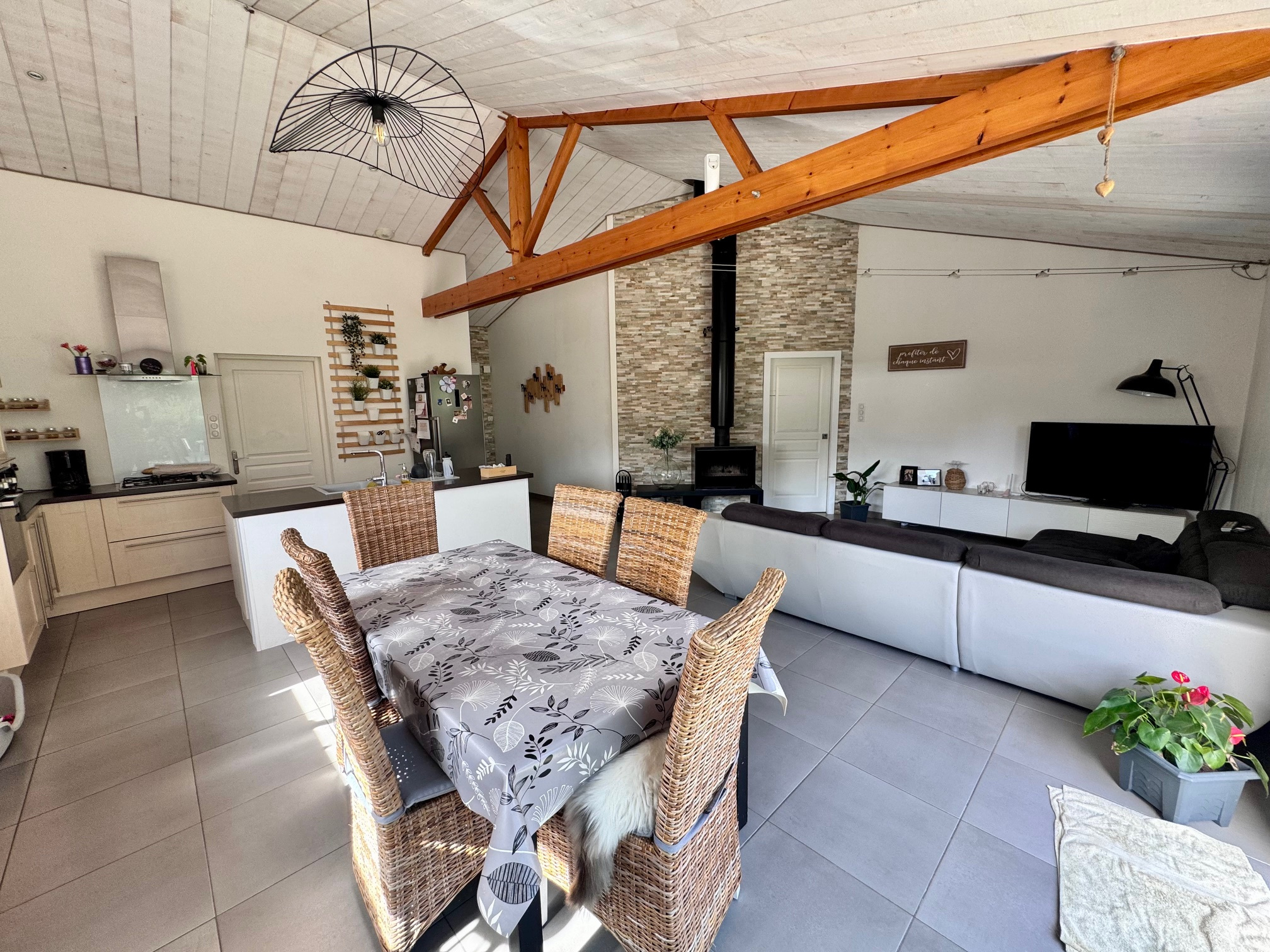 Située proche du centre bourg, cette maison de plain-pied de 2013 comprend : un hall d'entrée avec placard, une buanderie, une cuisine aménagée et équipée (une hotte, plaque de cuisson gaz, un lave-vaisselle, un four), un salon-salle à manger de 46 m2 environ avec un poêle à bois et donnant sur une grande terrasse.