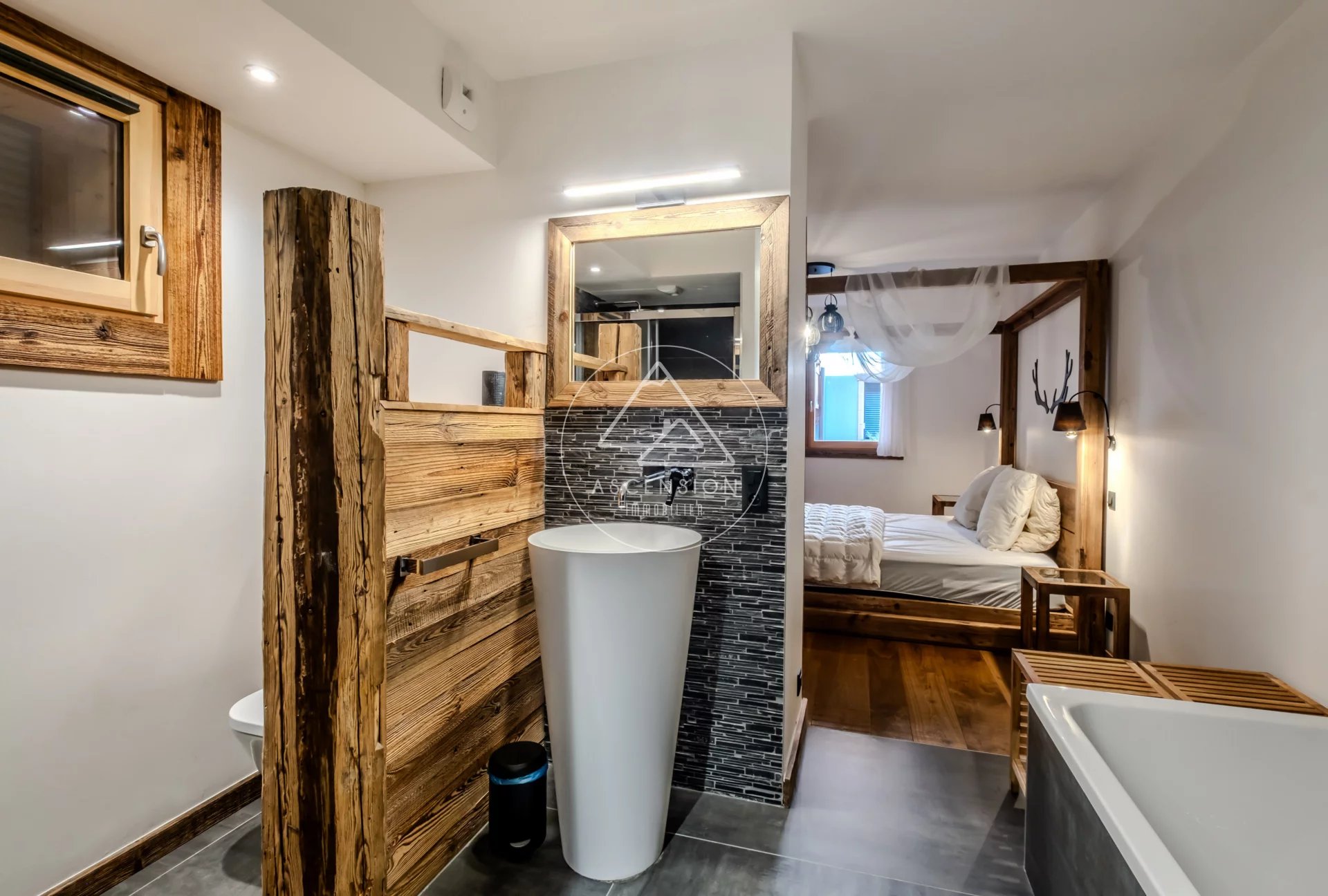 L’espace nuit comprend deux chambres confortables, chacune avec sa salle de bains et toilettes dans un style alpin contemporain.