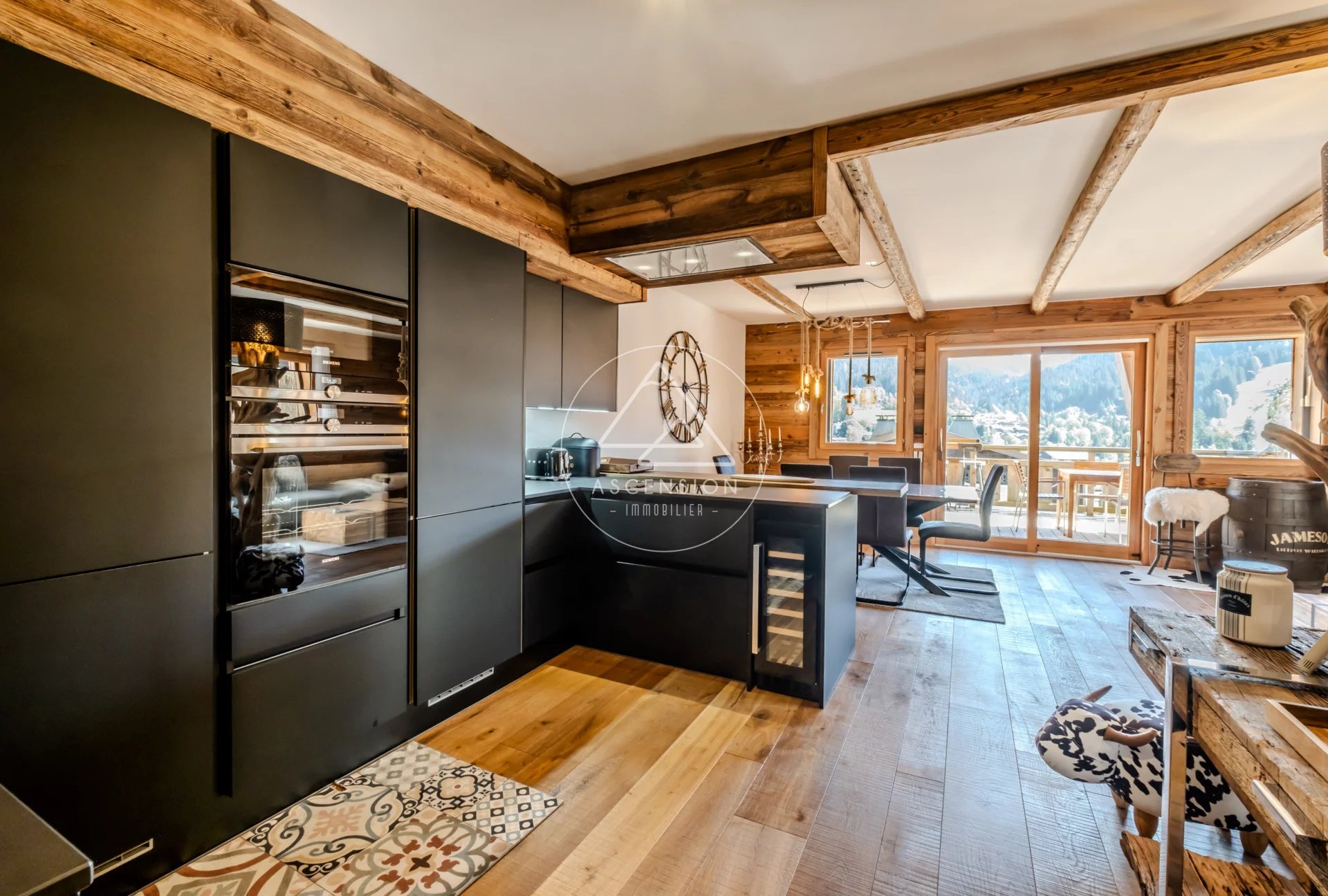 Il se compose d’une cuisine moderne entièrement équipée, ouverte sur un spacieux séjour lumineux donnant accès à une grande terrasse avec sauna privé, offrant une vue panoramique imprenable sur le village des Gets et les montagnes environnantes.