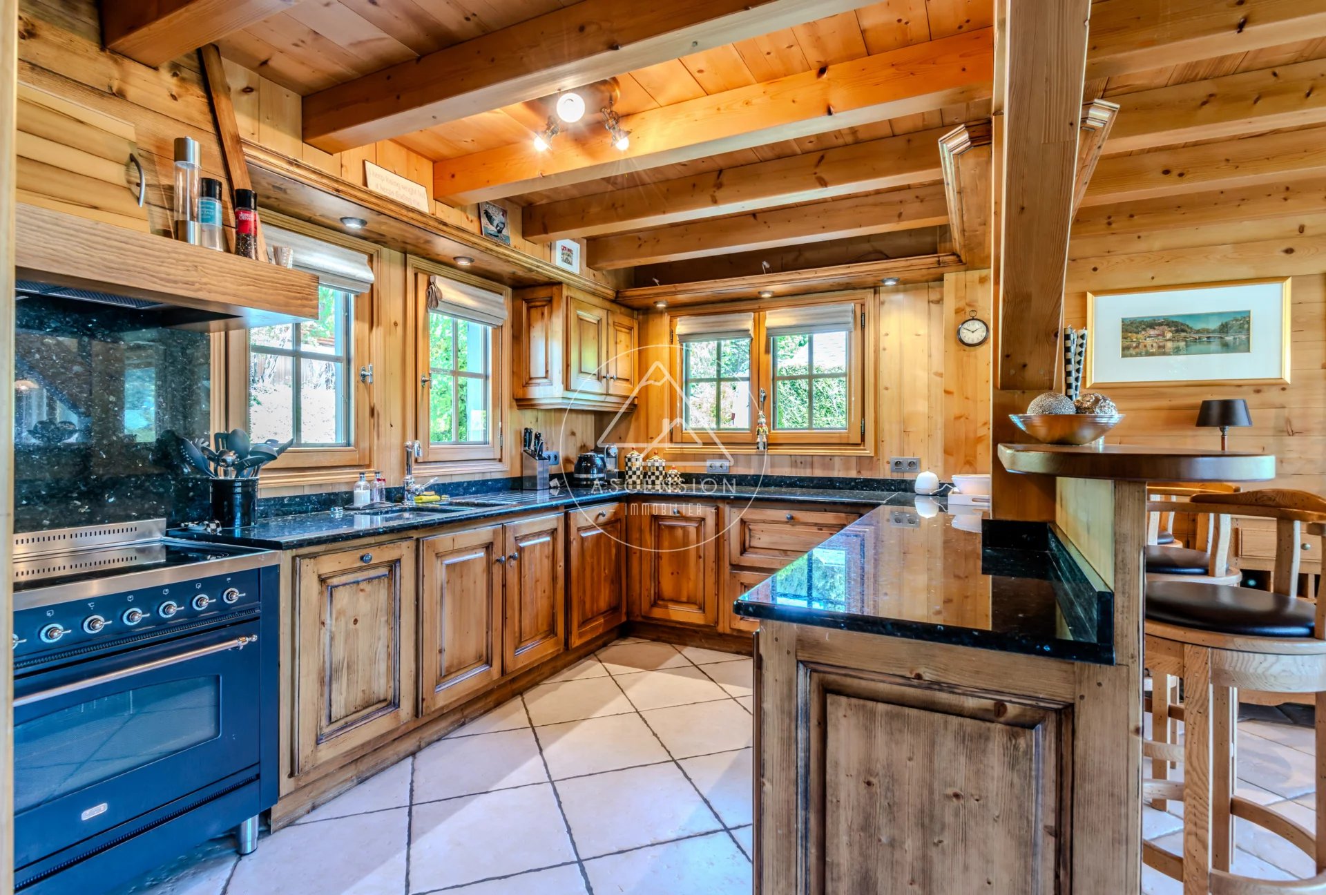 Construit en 2006, le chalet développe une surface généreuse de 223 m² répartie sur trois niveaux. L’entrée s’ouvre sur un vaste espace de vie lumineux, bénéficiant d’une orientation optimale. La cuisine ouverte, moderne et entièrement équipée avec plan de travail en granit, s’intègre harmonieusement à la salle à manger et au salon chaleureux agrémenté d’un poêle à bois. Une grande terrasse prolonge cet espace et offre une vue panoramique sur les montagnes.