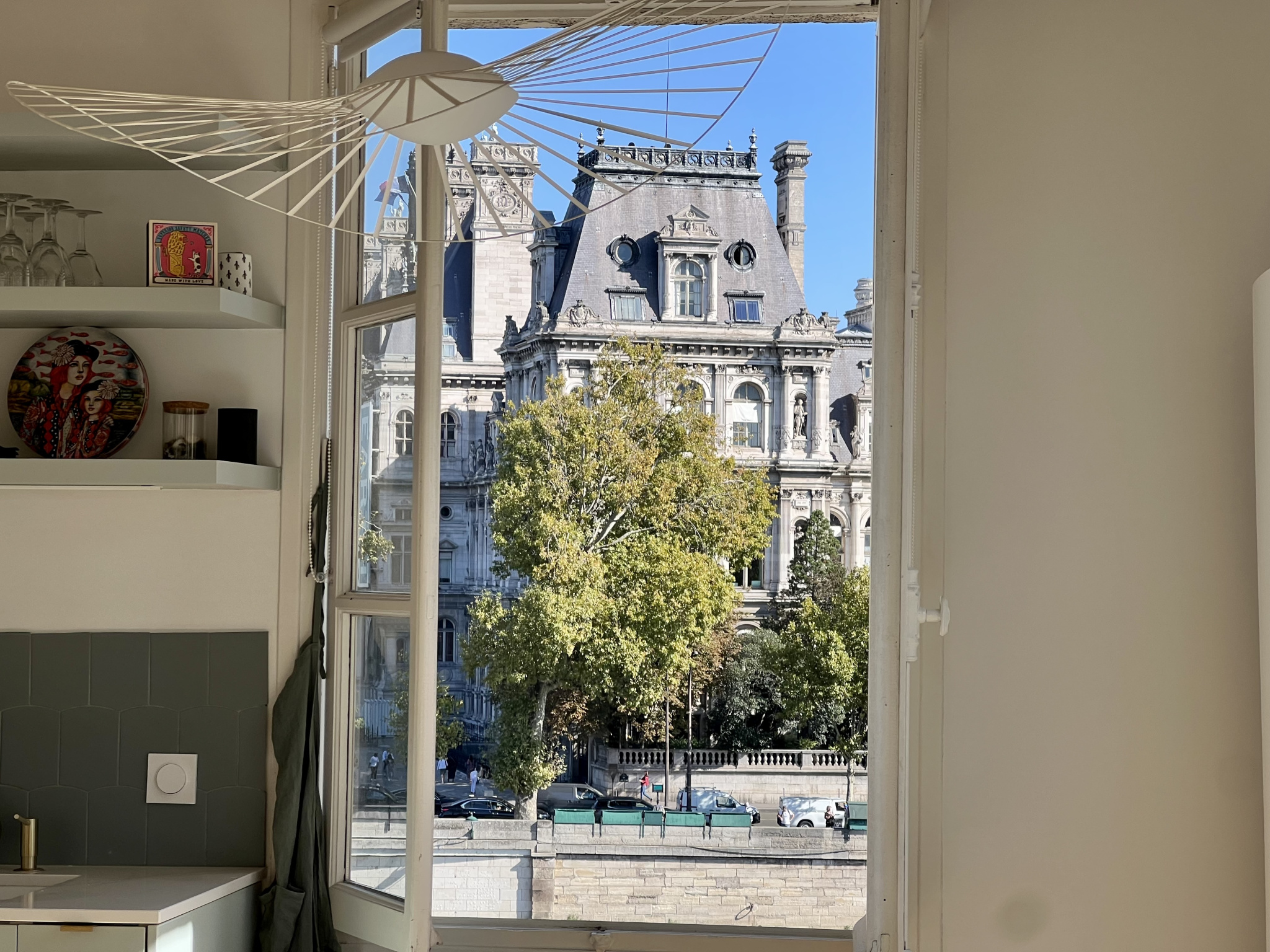 Ile de la Cité - Notre Dame, Exceptionnel appartement d'angle avec vue sur la Seine et l'Hôtel de Ville de Paris, immeuble historique 1750, appartement rénové avec de jolies vues, 4 eme étage, séjour 24 m2 avec cuisine américaine, chambre vue Seine, sde-wc, buanderie, placards, poutres, parquets, très belle rénovation d'un appartement calme et ensoleillé, très lumineux, proche Notre Dame et Quai aux Fleurs, métro 04 Cité à 4 minutes, RER B Saint Michel 5 minutes.