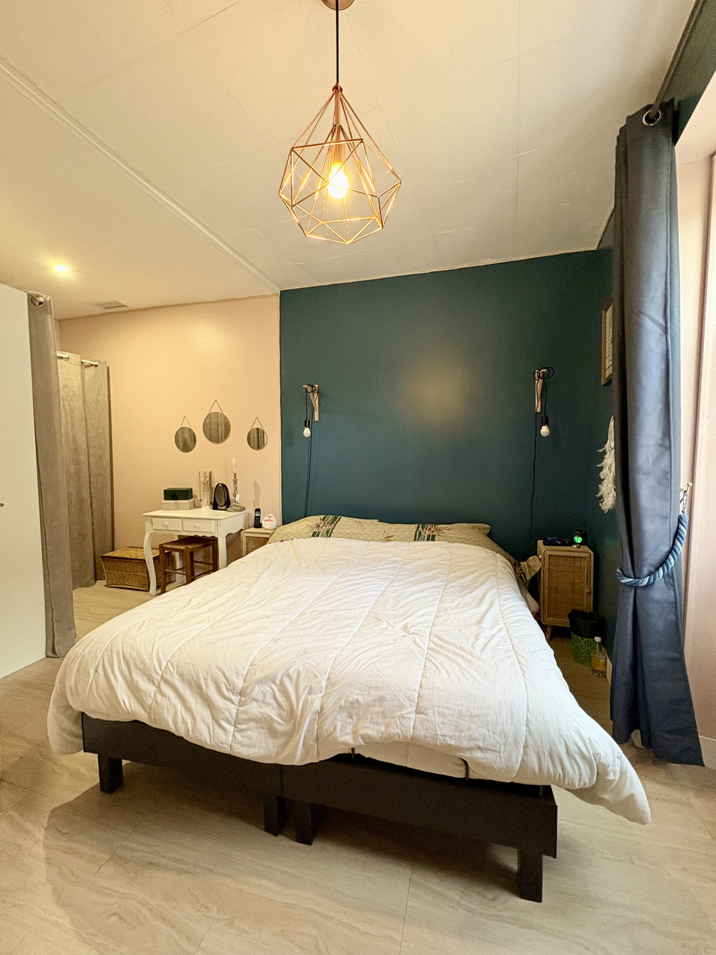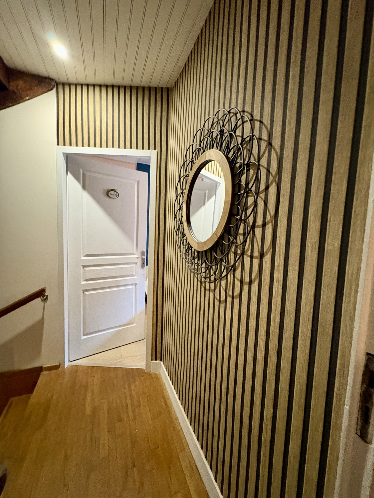 Niveau 1, le palier dessert une belle chambre avec dressing ainsi qu'une seconde grande pièce d'environ 15 m2, actuellement aménagée en espace de loisirs avec dressing. Cette pièce, traversante, donne accès à un petit couloir menant à une chambre et à une salle d'eau.