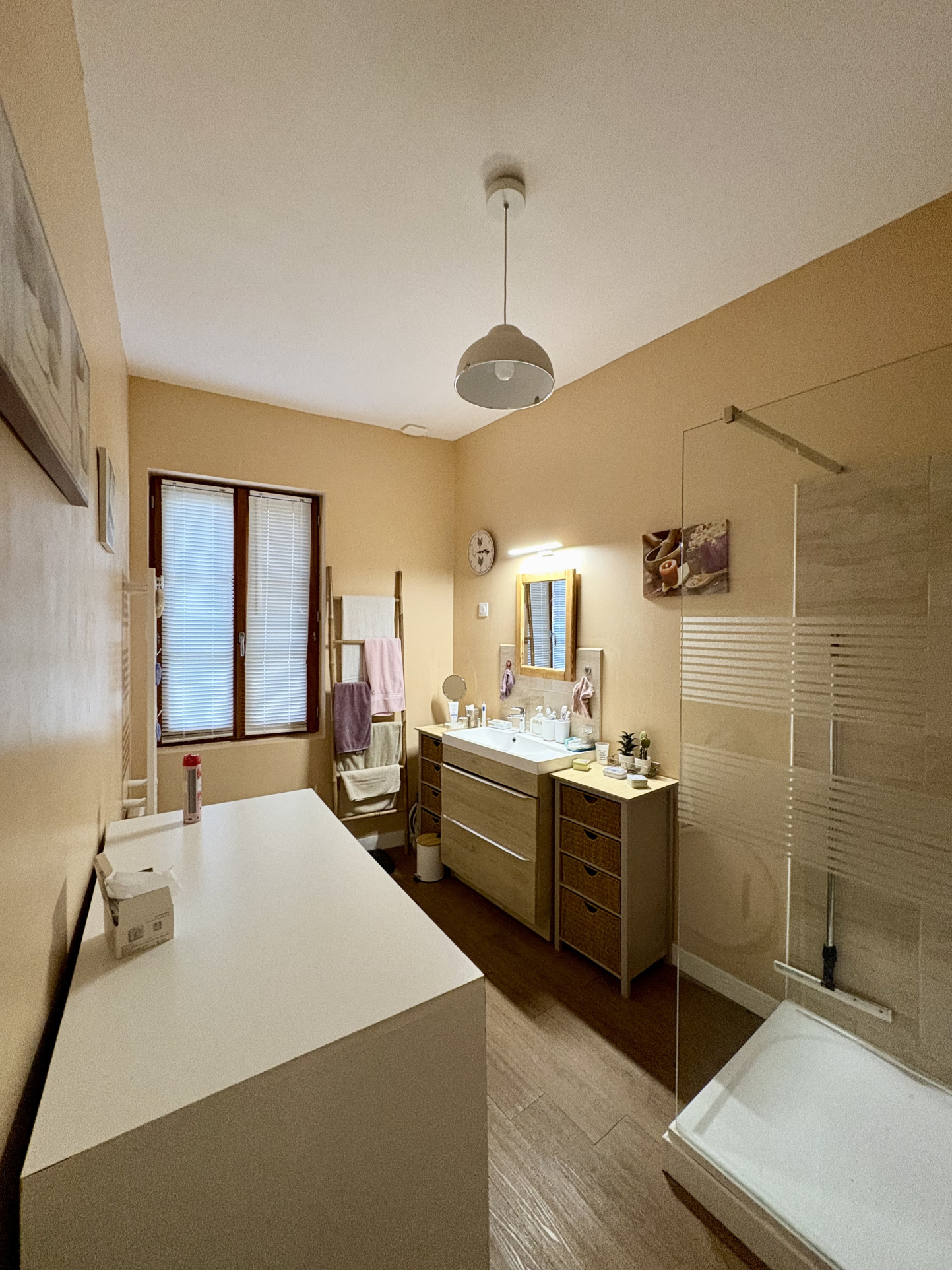 Upstairs, a landing leads to a spacious bedroom with a dressing area and a second large room of about 17 m2 currently used as a leisure space with built-in storage (formerly a bedroom). This room connects to a small hallway leading to another bedroom and a modern shower room.