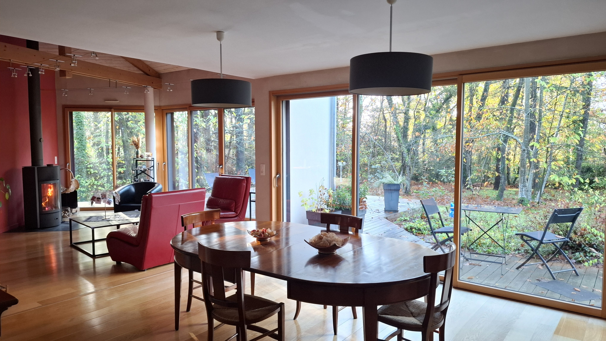 En extérieur, sur une parcelle de près de 2900m2, il y a une très grande terrasse bois qui entoure les pièces de vie, une autre terrasse et un abri de jardin