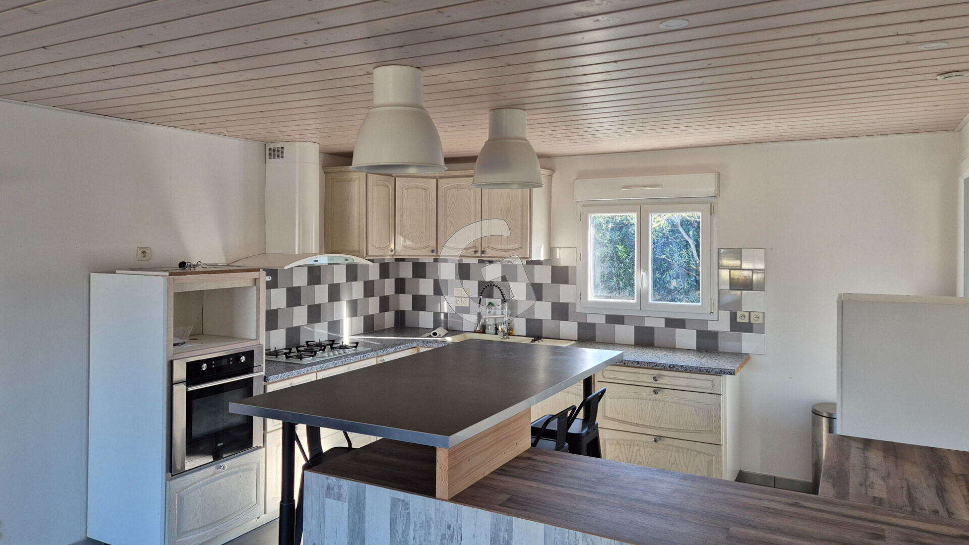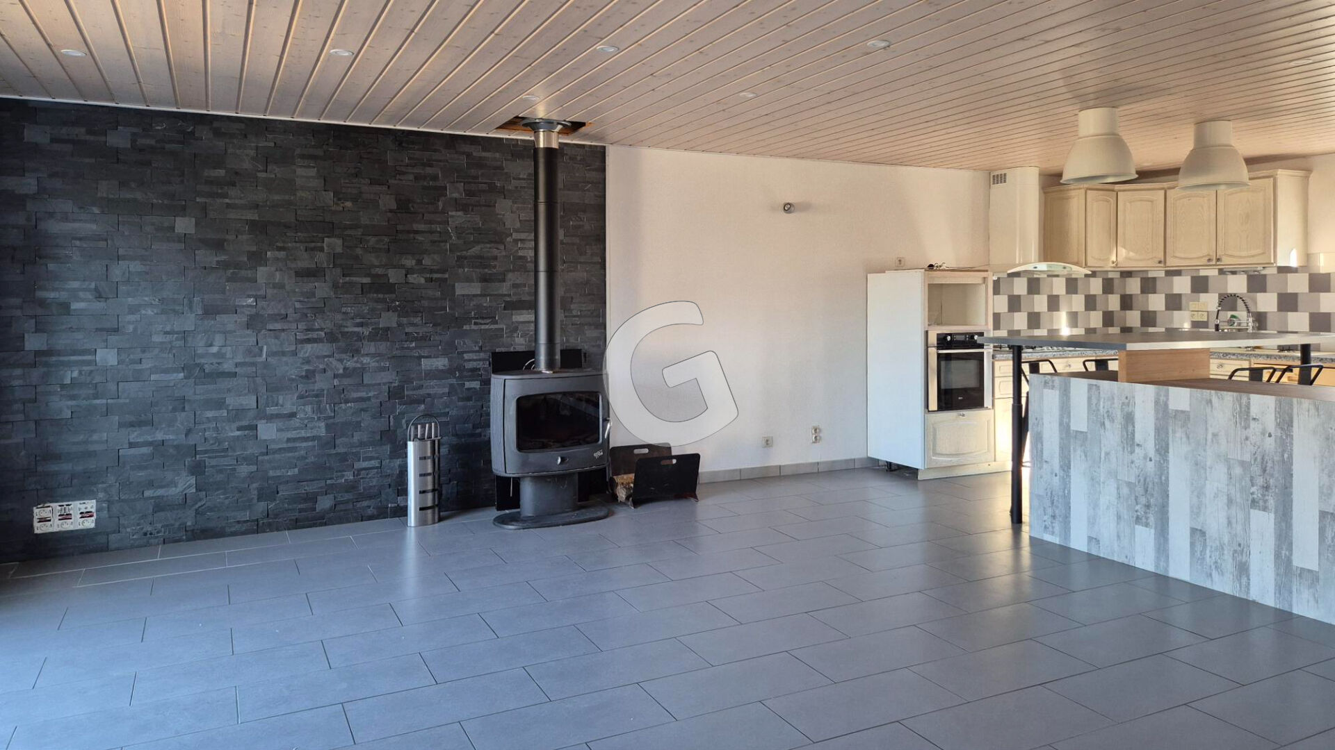 Maison d'habitation lumineuse comprenant : entrée, séjour/salon avec poêle et cuisine ouverte meublée, 3 chambres avec placard, salle d'eau, wc, dégagement et buanderie. Double garage, abri bois et terrain clos de 477 m².