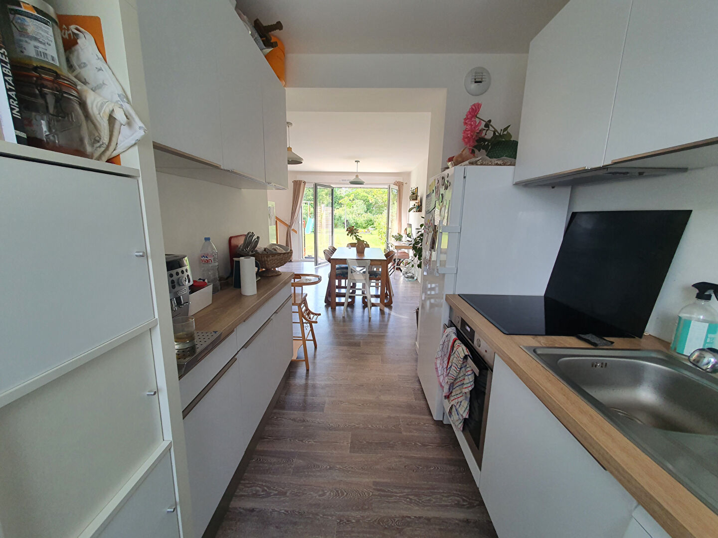 - Au rez-de-chaussée : une entrée avec placard, un WC, cuisine ouverte équipée (four, plaque de cuisson, hotte) et aménagée, un séjour-salon.