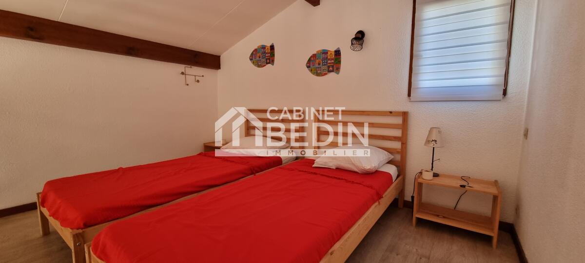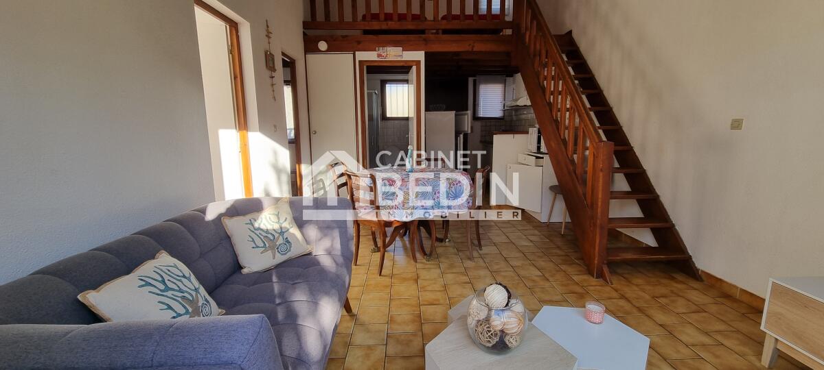 Exclusivité CABINET BEDIN - Maison 2 ch + mezzanine ? Terrasse 40 m². Située dans une petite copropriété de 10 lots, au calme et à proximité immédiate de la plage, cette maison est idéale pour un pied-à-terre ou un investissement locatif. Elle se compose d?un séjour lumineux avec grandes baies vitrées ouvrant sur une terrasse privative d?environ 40 m², d?une cuisine fonctionnelle, de deux chambres de plain-pied, d?une salle d?eau et d?une mezzanine spacieuse permettant d?accueillir plusieurs couchages supplémentaires.