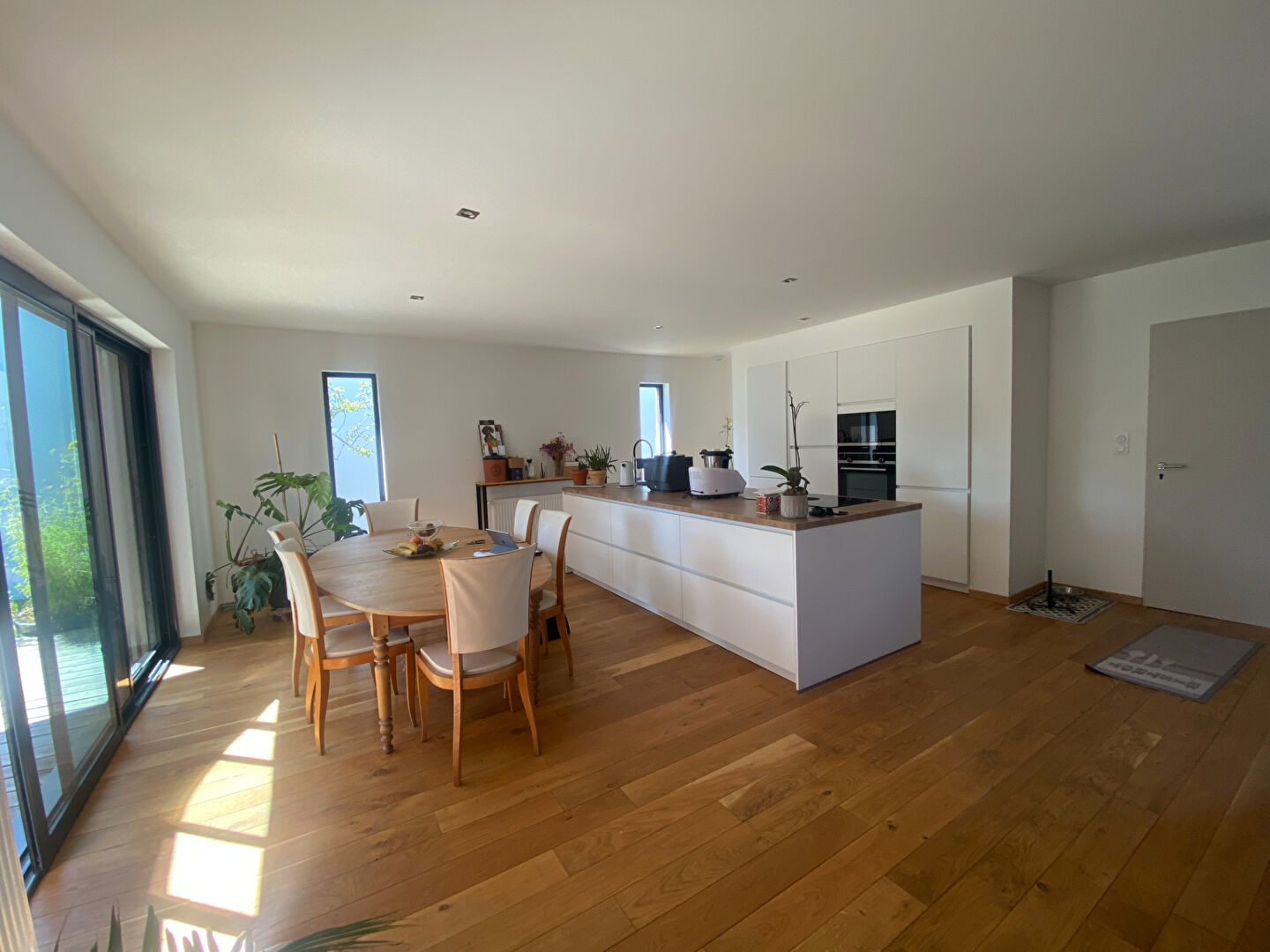 Elle offre une belle pièce de vie de 60 m² avec cuisine aménagée et équipée, un cellier, trois chambres, dressing, deux salles d'eau et deux WC, garage.