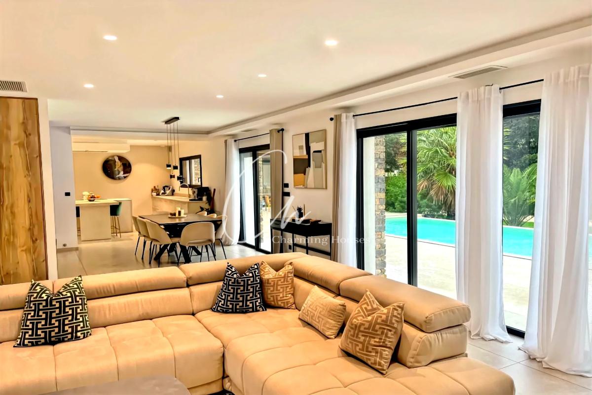 L'espace de vie principal, d'une superficie de 72 m2HB, réunit un séjour spacieux et lumineux ouvert sur une cuisine contemporaine entièrement équipée. De grandes baies vitrées prolongent naturellement la pièce vers l'extérieur et la piscine au sel (8x4m) entourée d'une belle terrasse.