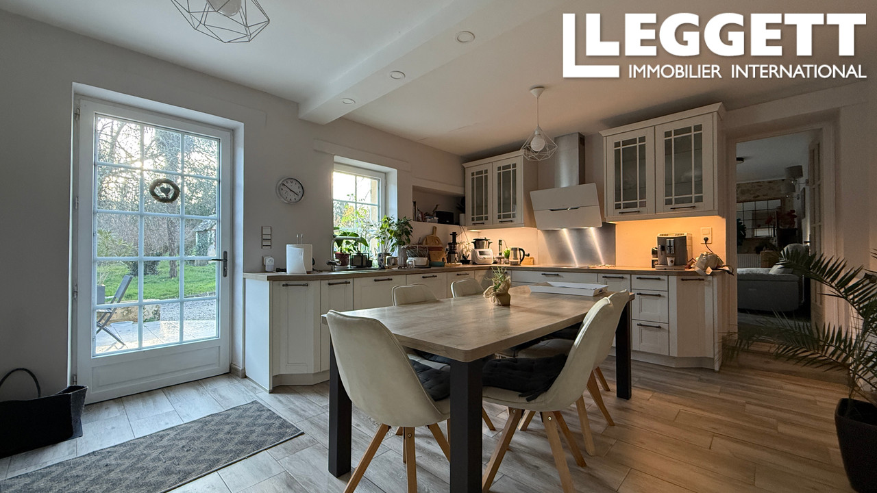 La maison principale offre environ 176 m² habitables avec cuisine dinatoire équipée, salon chaleureux avec insert, salle de bains et quatre chambres dont une avec dressing. Une pièce supplémentaire complète l'ensemble.