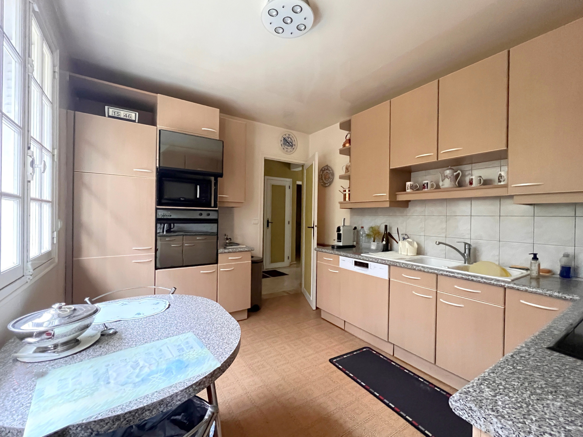 Accueil avec placard intégré, vaste salon / salle à manger lumineux avec une cheminée, cuisine équipée, dégagement menant à trois chambres, dont une suite avec salle de bains + WC privative, WC indépendant.
