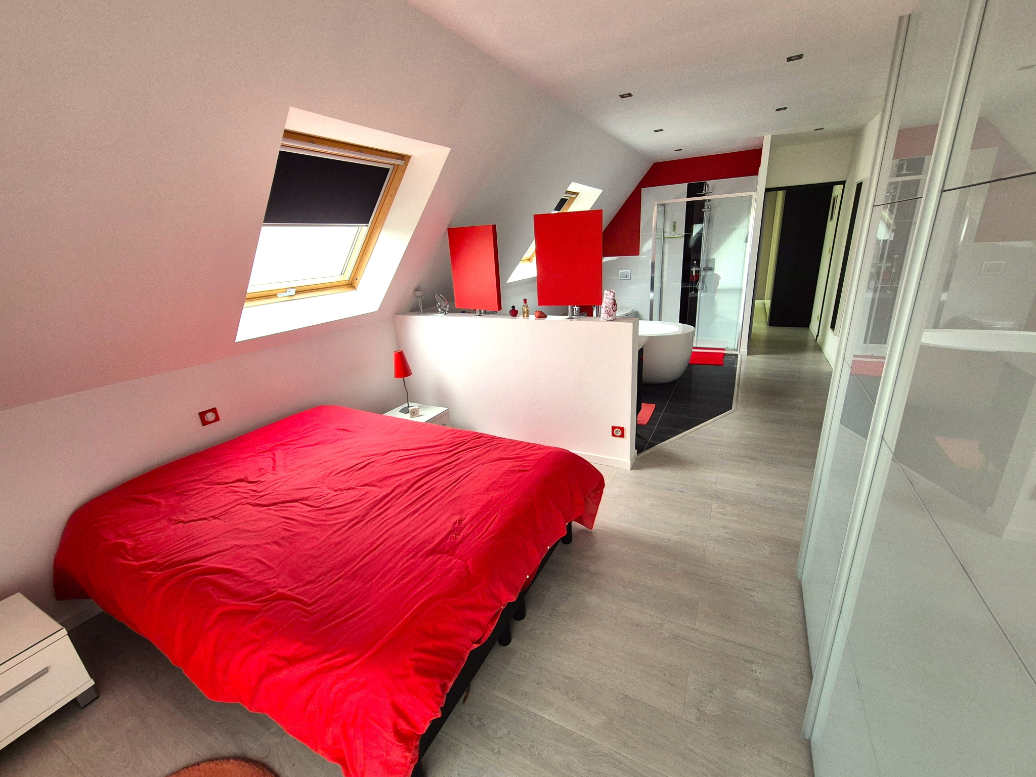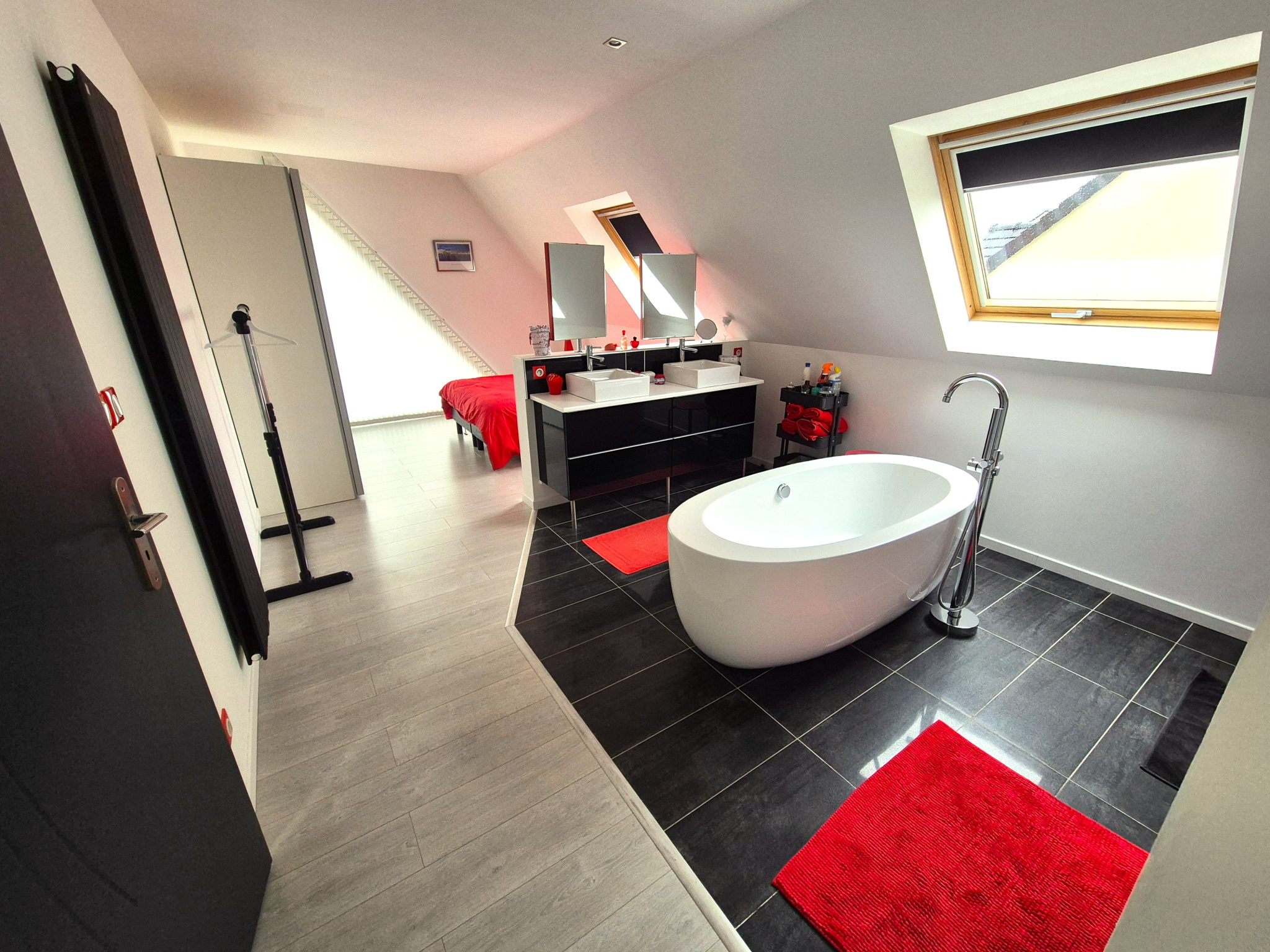 À l'étage, un vaste palier d'environ 49 m2 offre de nombreuses possibilités d'aménagement et dessert une grande suite parentale avec salle de bain ouverte et un large dressing.