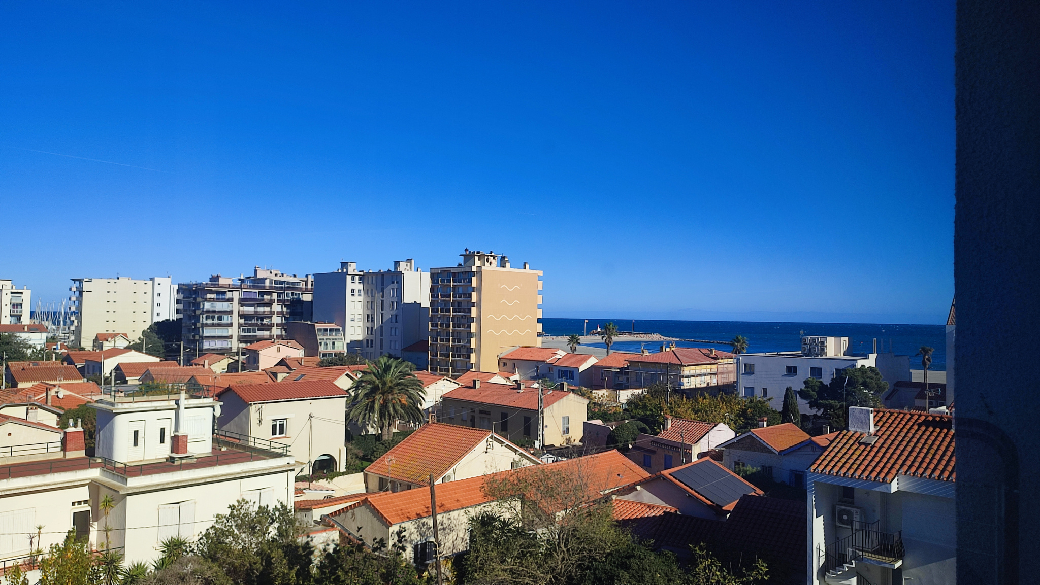 Grand T1 traversant de 42m2 + Loggia de 8 m2 , vendu meublé ( si besoin) , avec une Vue dégagée côté Mer et Port situé dans le quartier du Port à 10 minutes à pied de la place Méditerranée, au 4ème étage d'une résidence calme avec ascenseur , local à vélo et gardien.