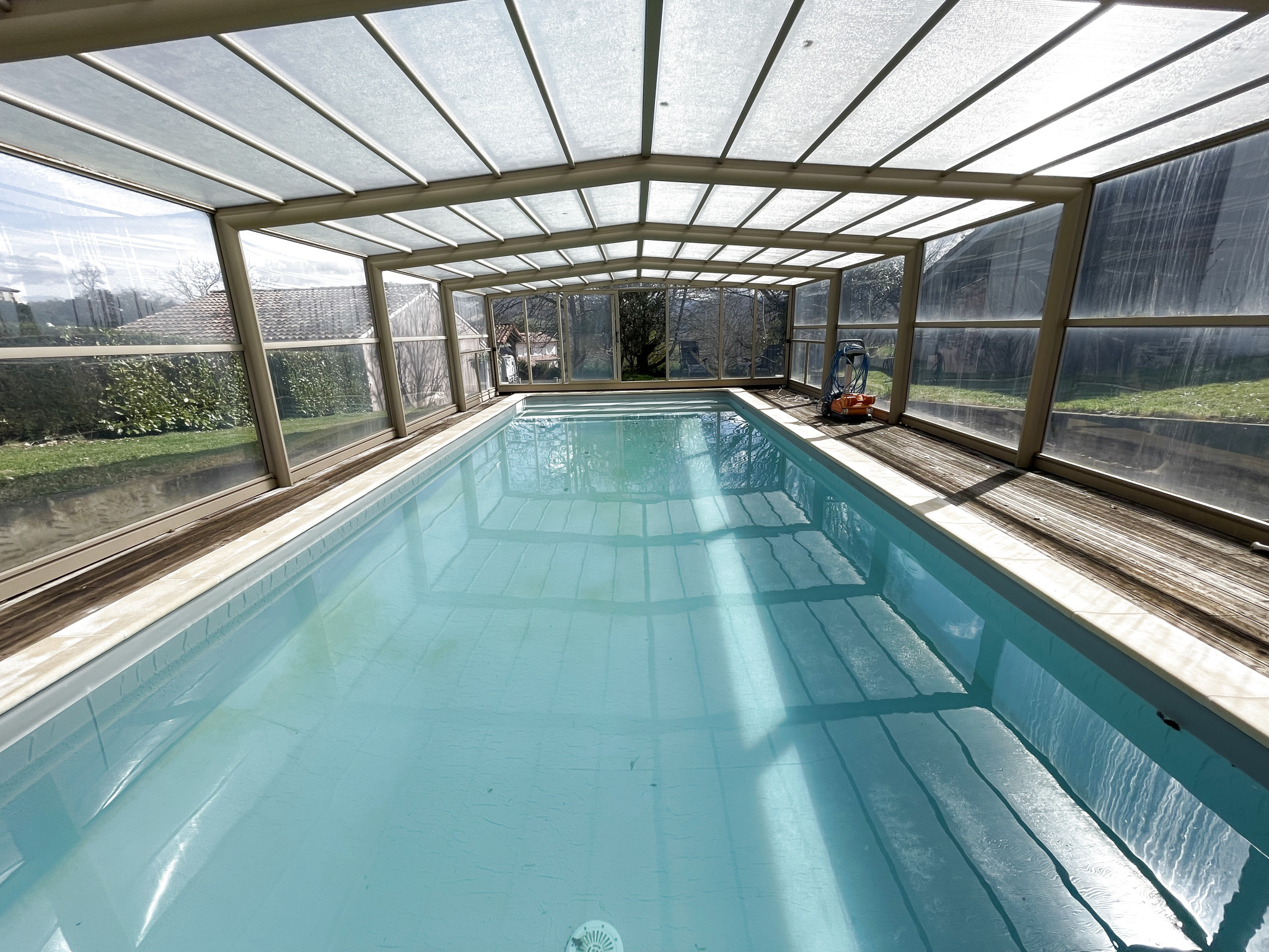 La maison est complétée par un garage double avec portails électriques de 70 m2 environ, un sous-sol aménagé de 32 m2 environ, une cave de 18 m2 environ, des panneaux solaires et une piscine couverte construite en 2013 de 10 x 4 au sel couverte, un abris pour camping-car et des abris bois