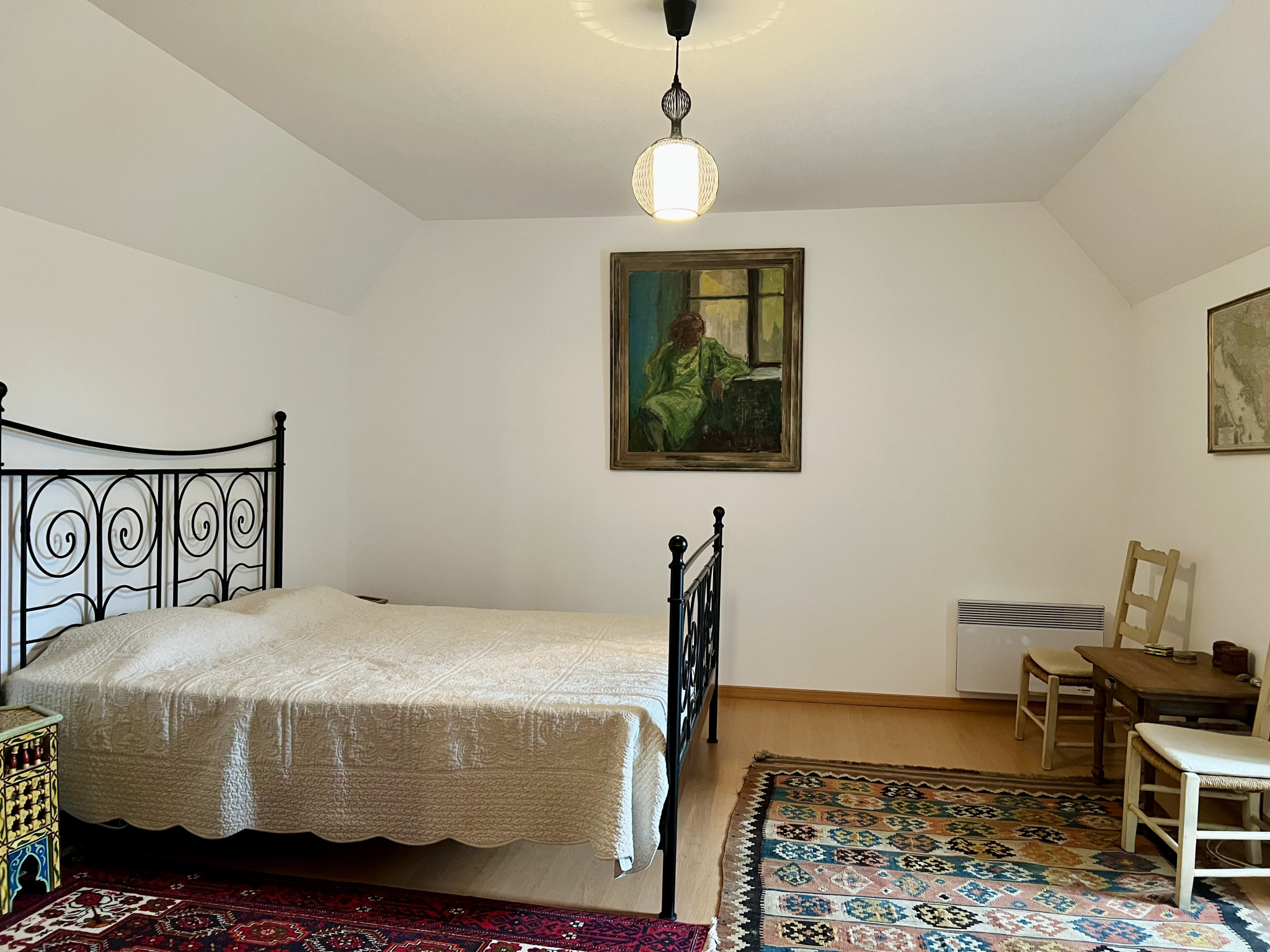 À l'étage, deux chambres de 20 m2 chacune et une salle de bain avec WC apportent des volumes généreux pour toute la famille. Chauffage par radiateurs électriques et poêle à bois, double vitrage et combles isolés récemment assurent un confort optimal.