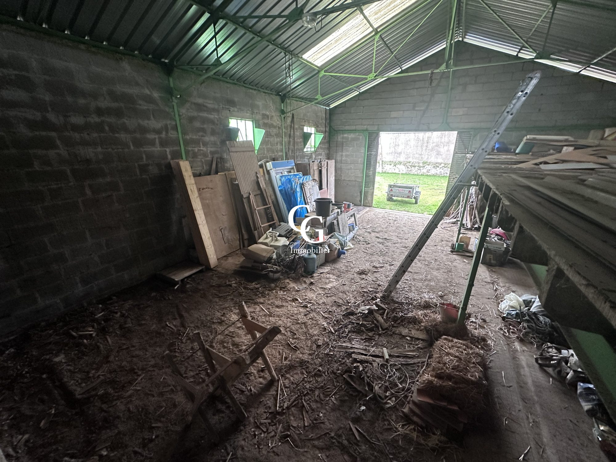 Sur un terrain en partie clos de 1263m², un bâtiment en parpaing et charpente métallique avec potentiel de réhabilitation d'une surface d'environ 168m² (9.97mètres par 16.90 mètres), avec une belle hauteur de 4.50 mètres en partie basse et de 6.60 mètres en partie haute.
