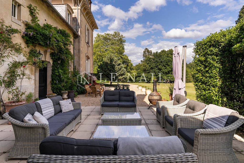 L’entrée sur la propriété se fait par un imposant portail ouvert dans le mur qui protège les lieux sur une partie de leur périphérie. Le château, sur un petit promontoire, domine un vaste parc à l’anglaise descendant en pente douce vers un ruisseau qui serpente au travers des bois de la propriété. Une surprenante rivière anglaise (rivière artificielle) alimentée par une source et une piscine de belles dimensions complètent le parc. A l’écart, une prairie bordée d’arbres permettrait d’installer des chevaux. La superficie de l’ensemble atteint près de huit hectares et demi.