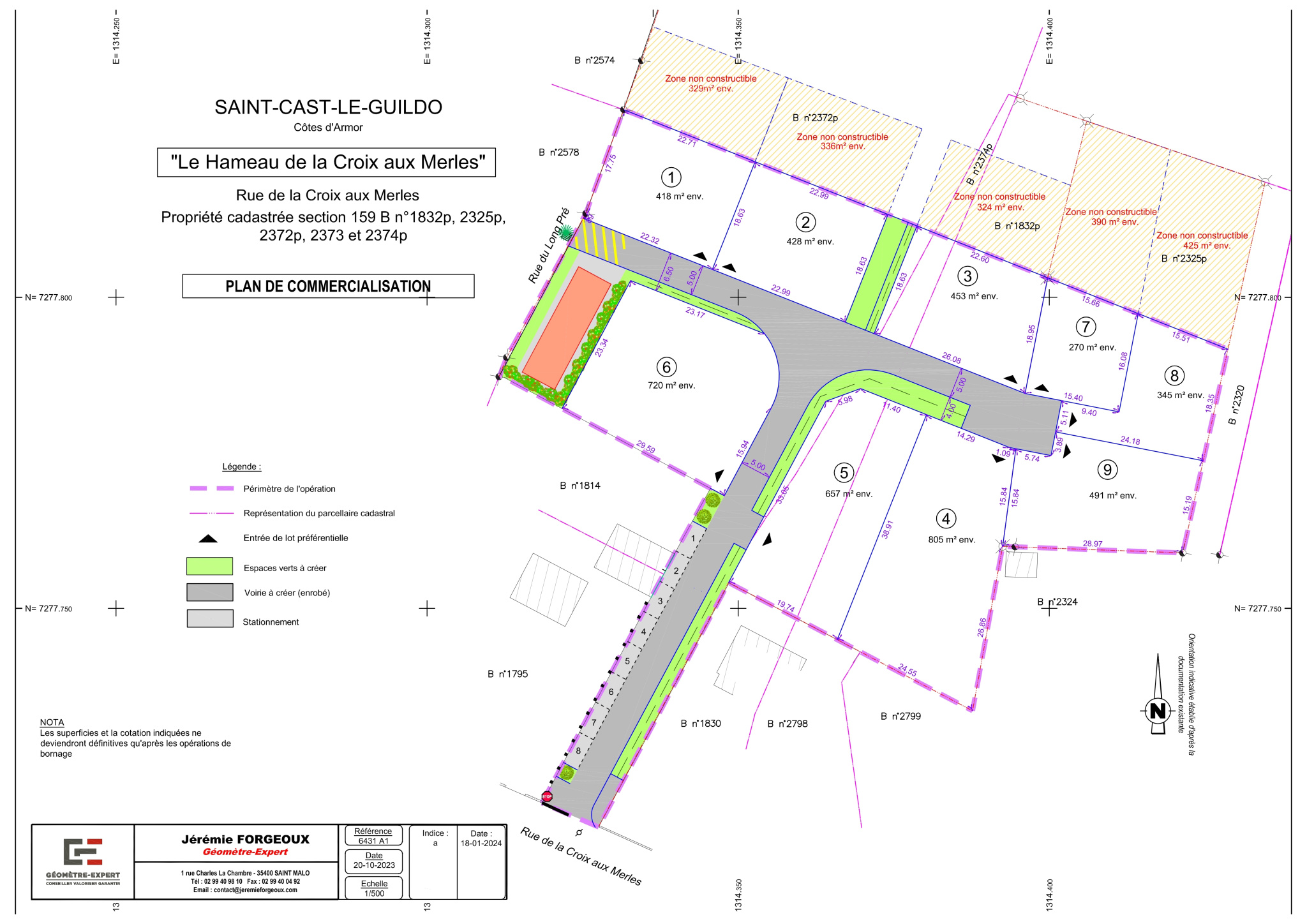 ARMOR CONSEIL IMMOBILIER Geoffrey Perrée vous propose des terrains constructibles viabilisés à Notre-Dame-Du-Guildo, commune de Saint-Cast-Le-Guildo, dans un lotissement privé libre de constructeur. Venez construire la maison de vos rêves à proximité directe des commerces et des écoles et à moins de 5 minutes en voiture de la mer. Vous trouverez dans cette annonce le plan des lots ainsi que le prix des différents terrains. Le trait violet représente la zone de constructibilité. La partie hachurée représente la partie non constructible des terrains.