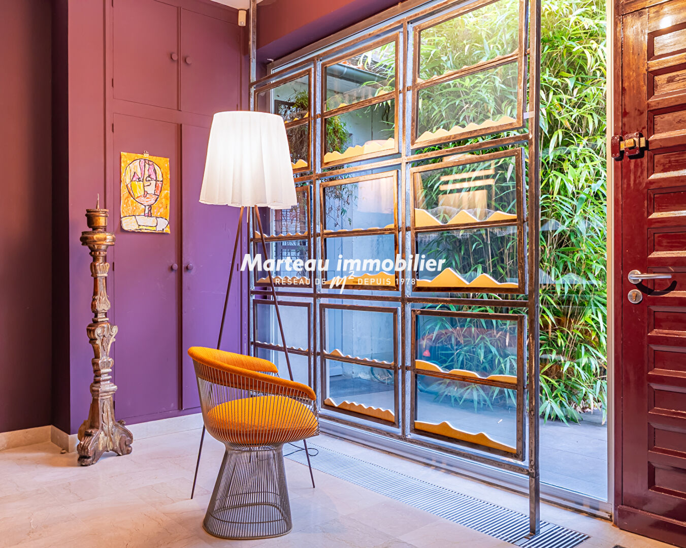 A droite un patio baigné de lumière avec vue sur le parc et sa pièce d'eau centrale. La maison s'ouvre ensuite sur un magnifique salon d'environ 90 m², la cheminée dessinée par l'artiste Jean Bernard Métais amène une élégance chaleureuse en lien avec le parc dessiné.