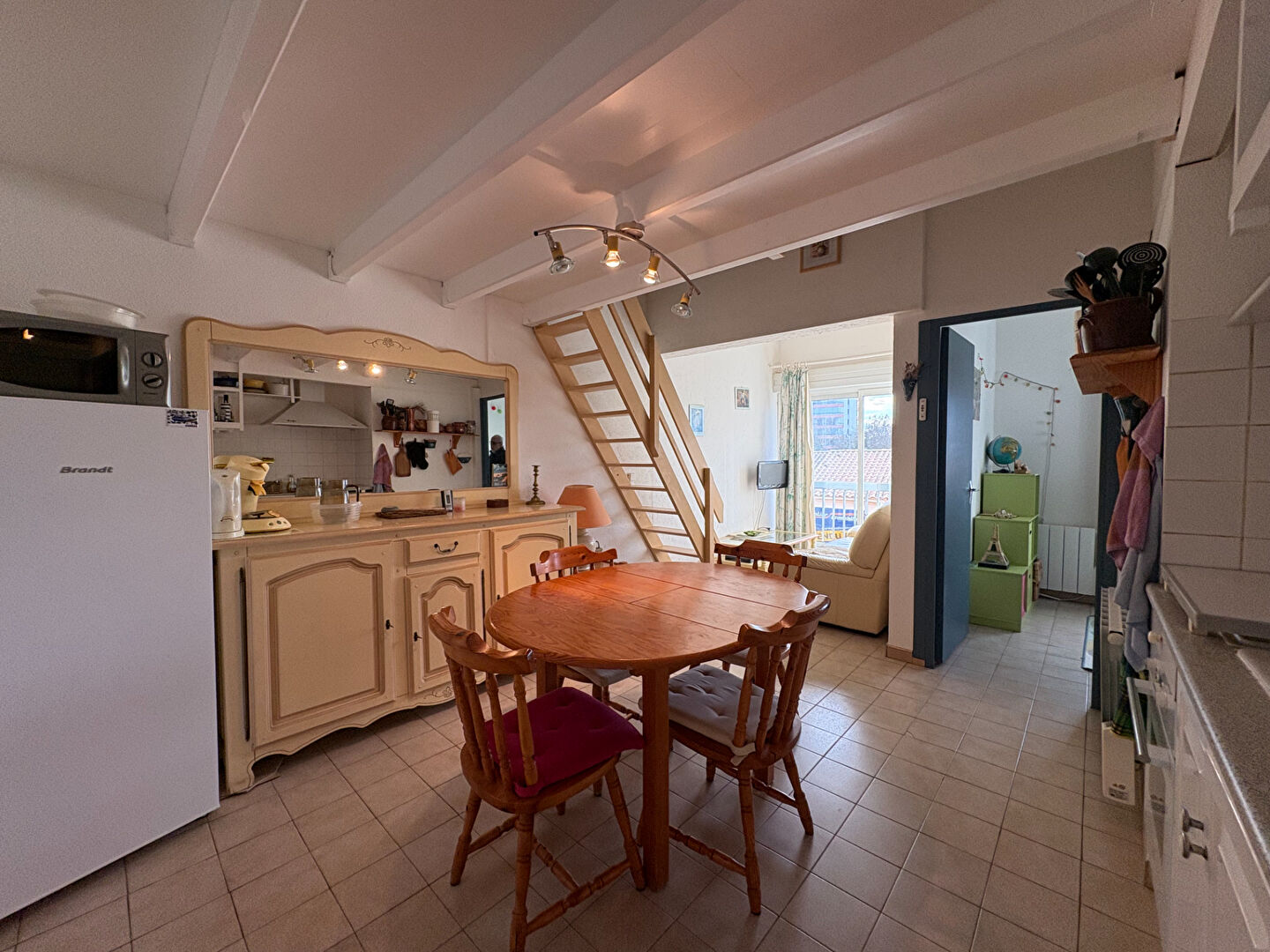 Situé à 200 mètres de la plage, au 2ème étage d'une copropriété, cet appartement vendu meublé dispose d'une pièce à vivre avec salle à manger, cuisine, coin salon.