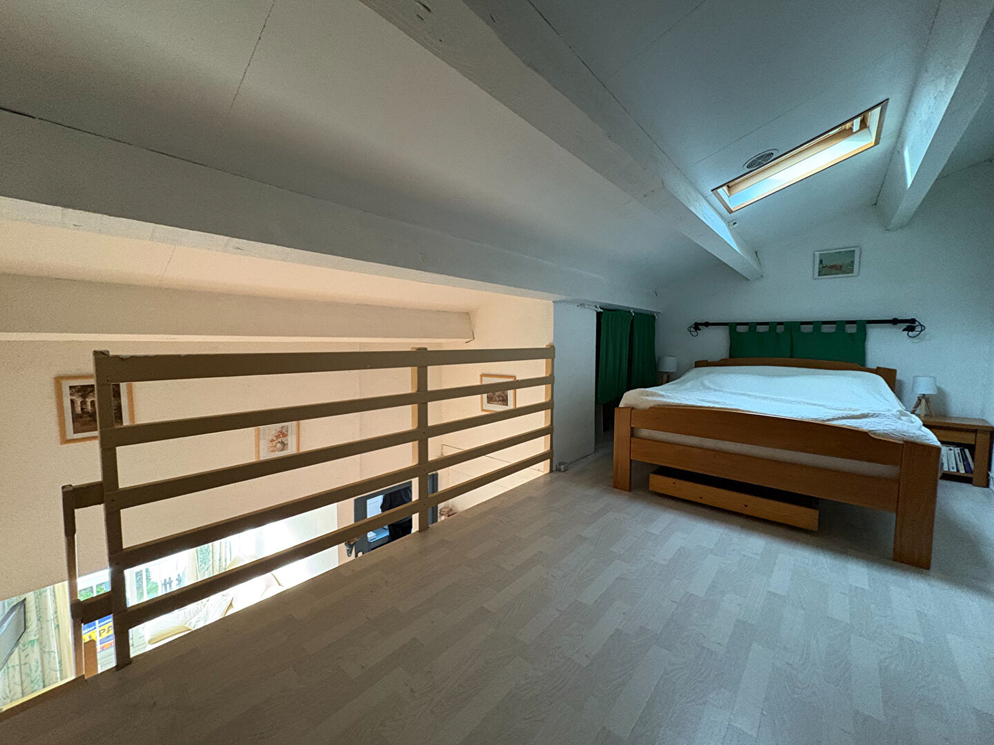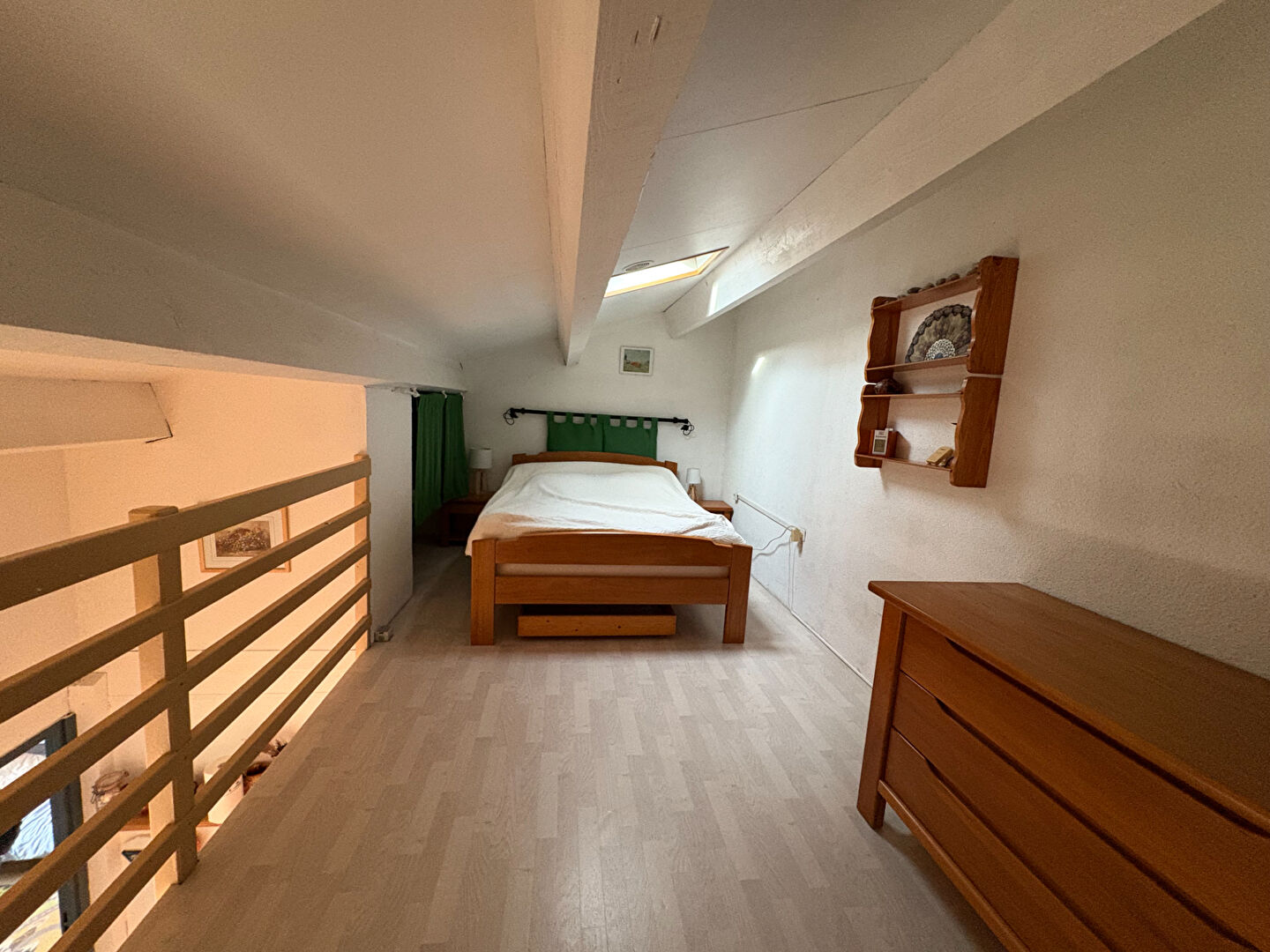 Une chambre avec lit superposé et beaucoup de rangements sur toute la hauteur, une salle d'eau avec wc et une deuxième pièce en mezzanine avec lit double.