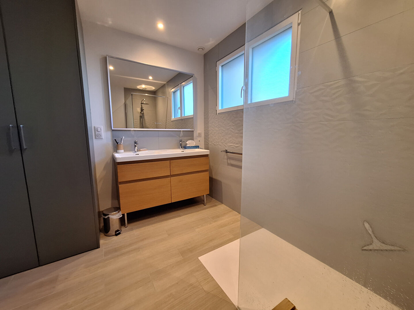 - au rez de chaussée, une entrée donnant sur une salle à manger, un jardin d'hiver, une cuisine semi-ouverte, entièrement rénovée, aménagée et équipée, un coin salon avec une cheminée à foyer fermé, un dégagement avec placard desservant la salle de douche, le WC et une chambre.