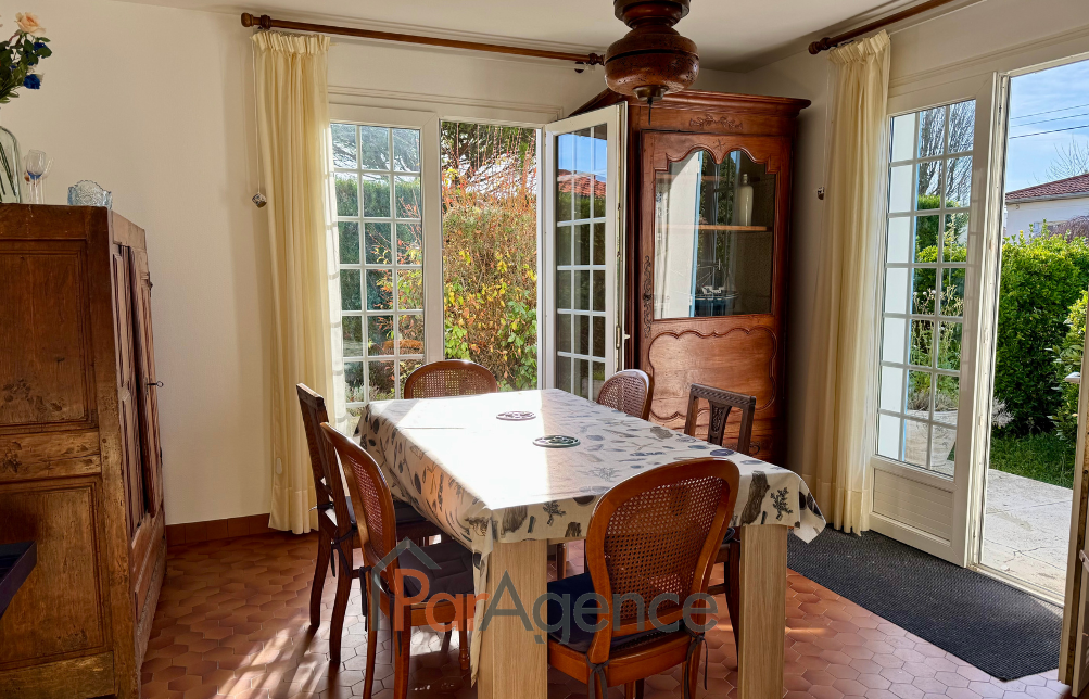 VAUX-SUR-MER 400 m centre et commerces et 1400 m plage maison de plain-pied de 94 m2 habitables située dans un quartier calme et agréable et comprenant: salon exposé plein sud ouvrant sur terrasse et jardin, cuisine aménagée séparée ouvrant sur jardin, dégagement avec placard, deux grandes chambres dont une avec placard, wc avec lave-mains, salle de bains. Chauffage central fuel. Un garage attenant de 24m2. Possibilité de stationner plusieurs véhicules sur le terrain. Le tout édifié sur un terrain clos et arboré sans vis à vis de 737 m2. Les informations sur les risques auxquels ce bien est exposé sont disponibles sur le site Géorisques : ww.georisques.gouv.fr Prix 412 700 EUR dont honoraires d'agence à la charge de l'acquéreur 4,5 % TTC soit 17 700 EUR (395 000 EUR hors honoraires). https://www.par-agence.fr/nos-honoraires.