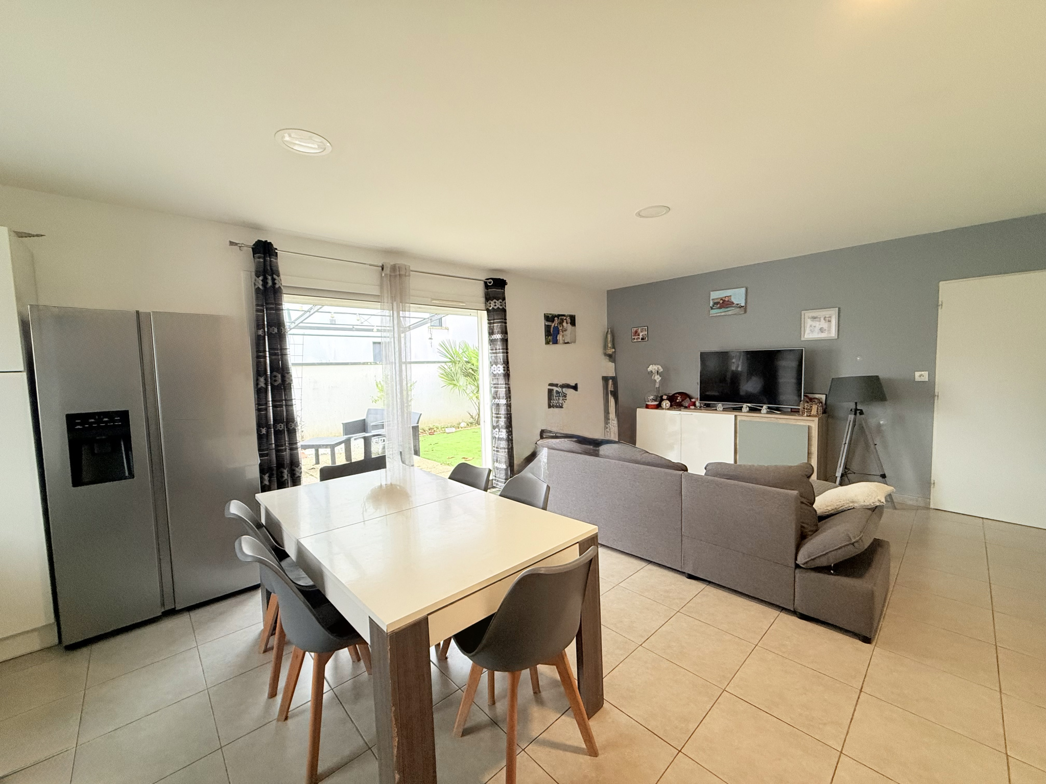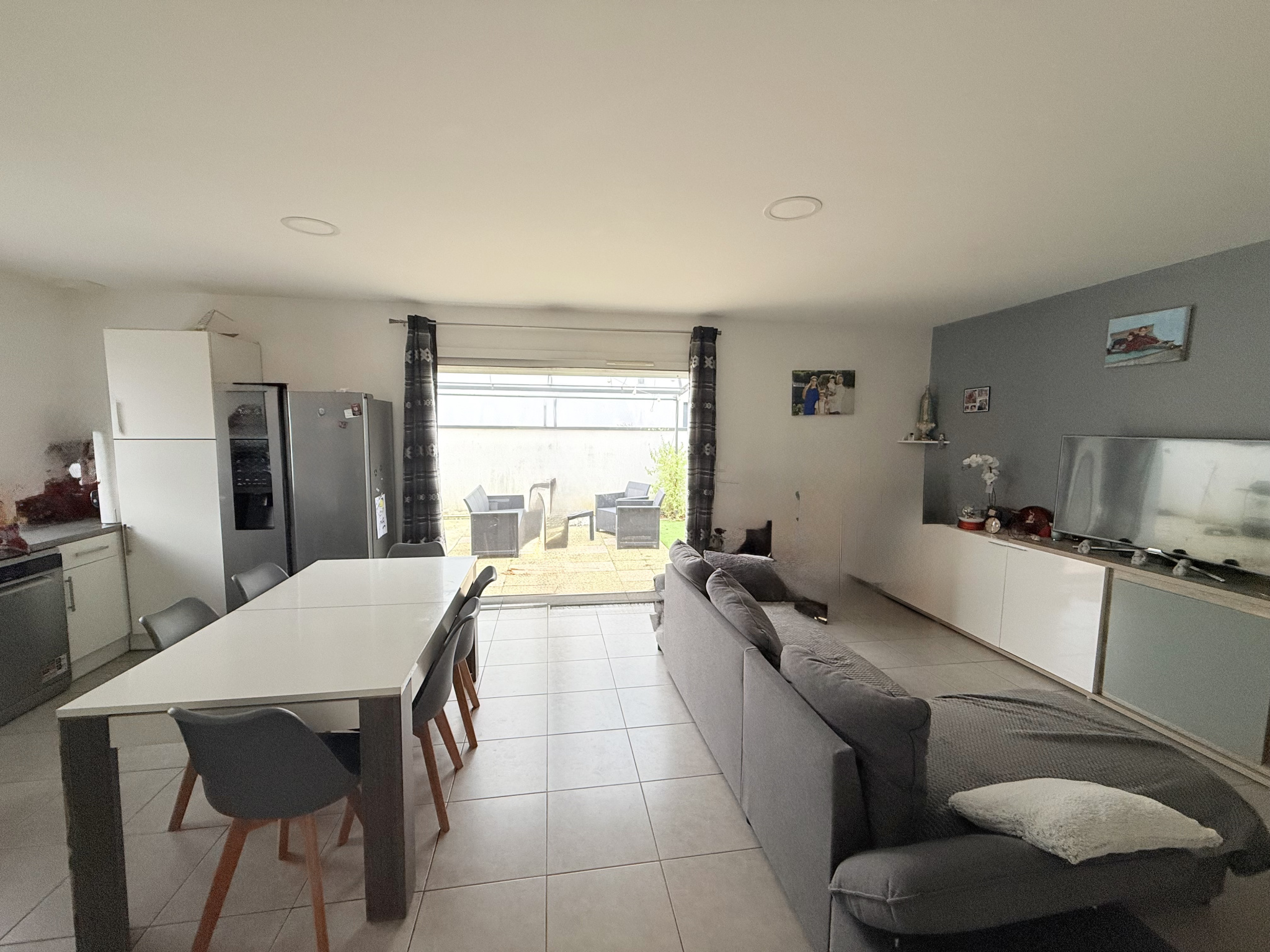 La maison s'ouvre sur une entrée, puis une belle pièce de vie moderne et lumineuse avec une cuisine ouverte, un espace salle à manger convivial et un salon chaleureux.