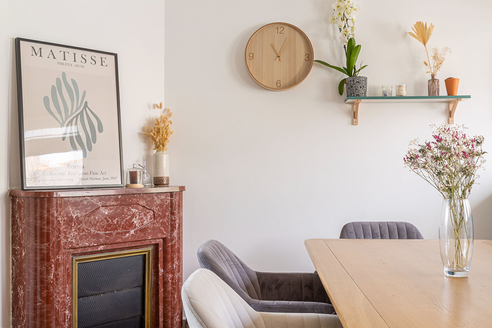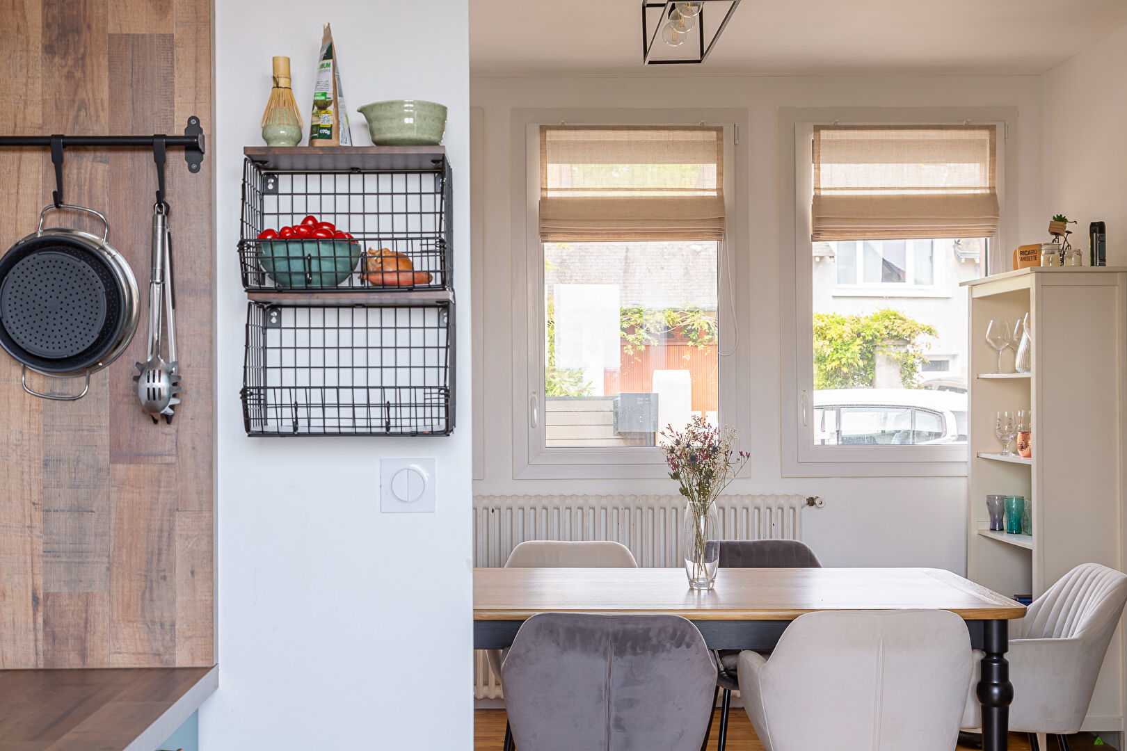 Au rez-de-chaussée, une salle à manger lumineuse s'ouvre sur une cuisine contemporaine entièrement repensée, pensée pour allier esthétique et fonctionnalité.