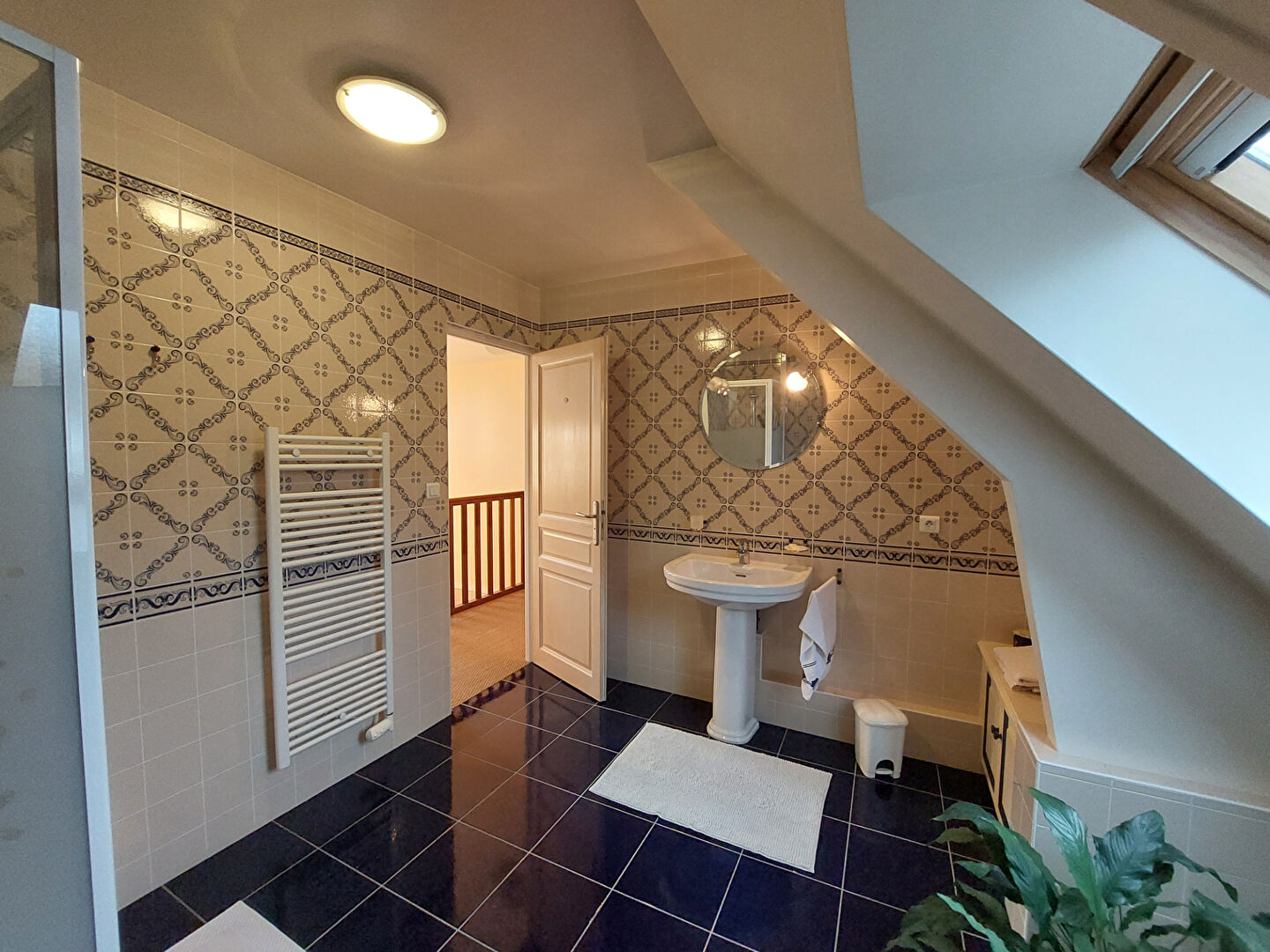 A l'étage: deux chambres dont une avec rangements sous mansardes, une salle d'eau avec WC et une grande salle de jeux.