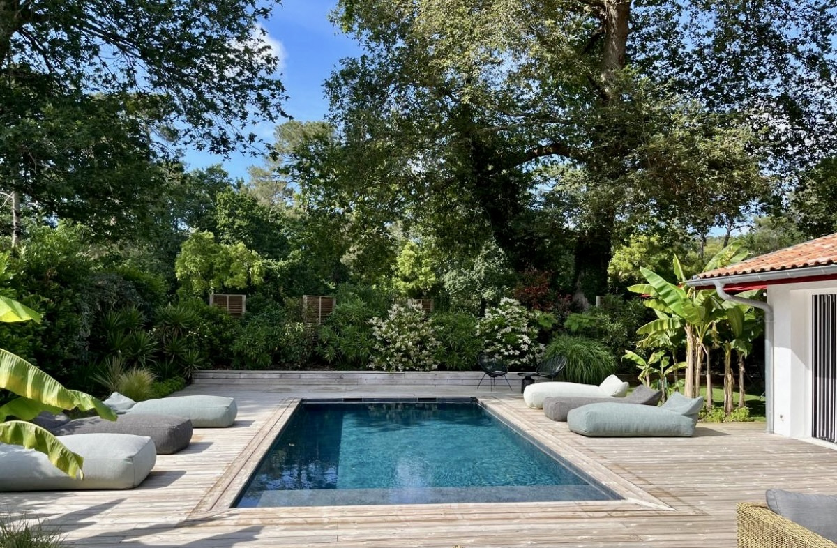 La villa présente une interprétation contemporaine de l'architecture landaise, modernisée avec élégance tout en conservant son authenticité.