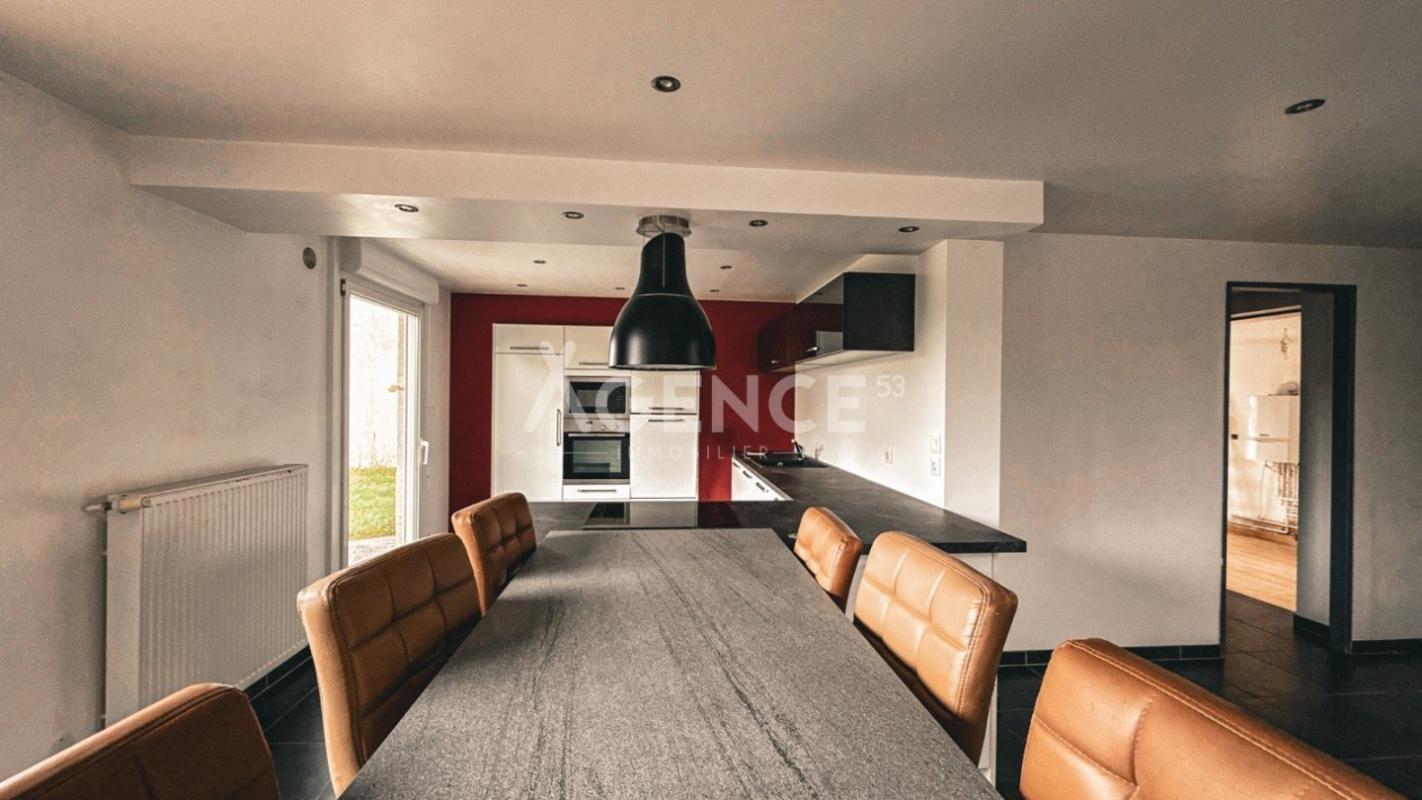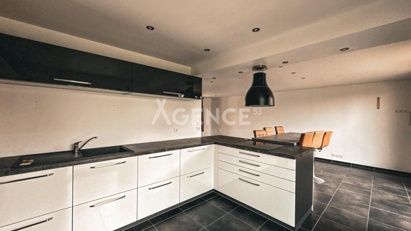 Grande pièce de vie de plus de 40 m², lumineuse, avec une cuisine équipée moderne et fonctionnelle.