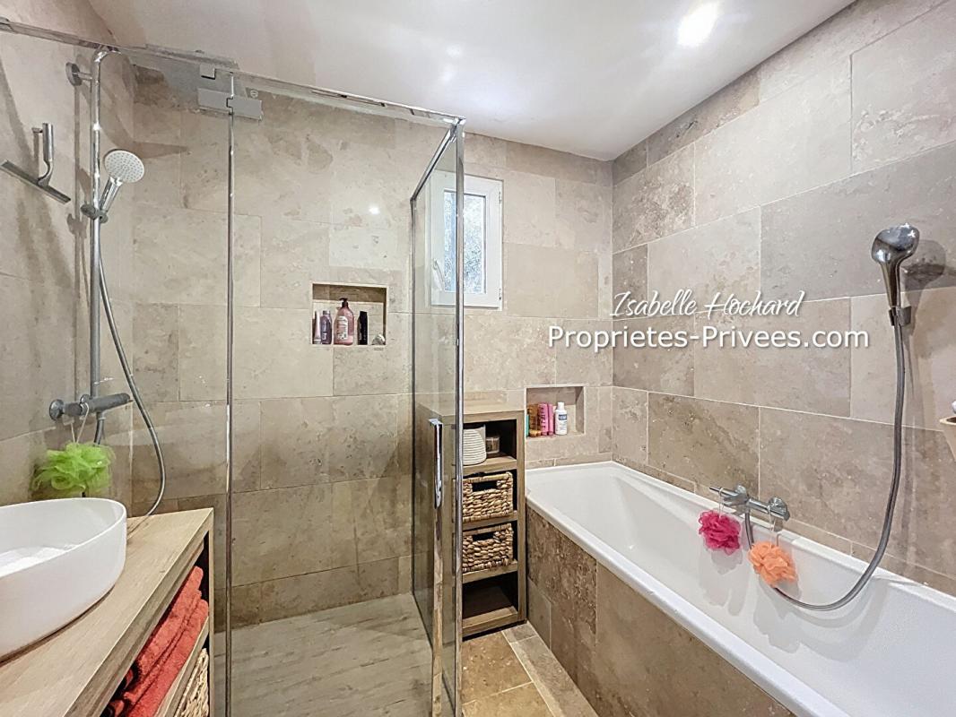 La maison offre également une salle de bain contemporaine avec baignoire et douche et coin buanderie fermée, très pratique au quotidien.
