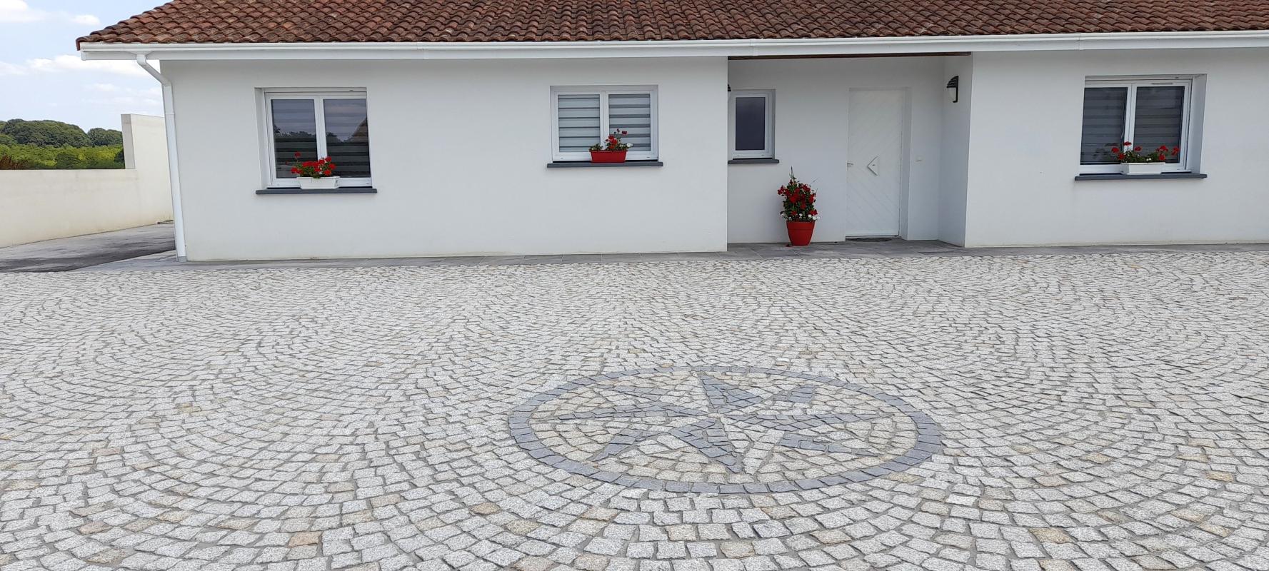 Grande cour en pavés portugais et jardin paysager, parfaits pour les loisirs et moments de détente
