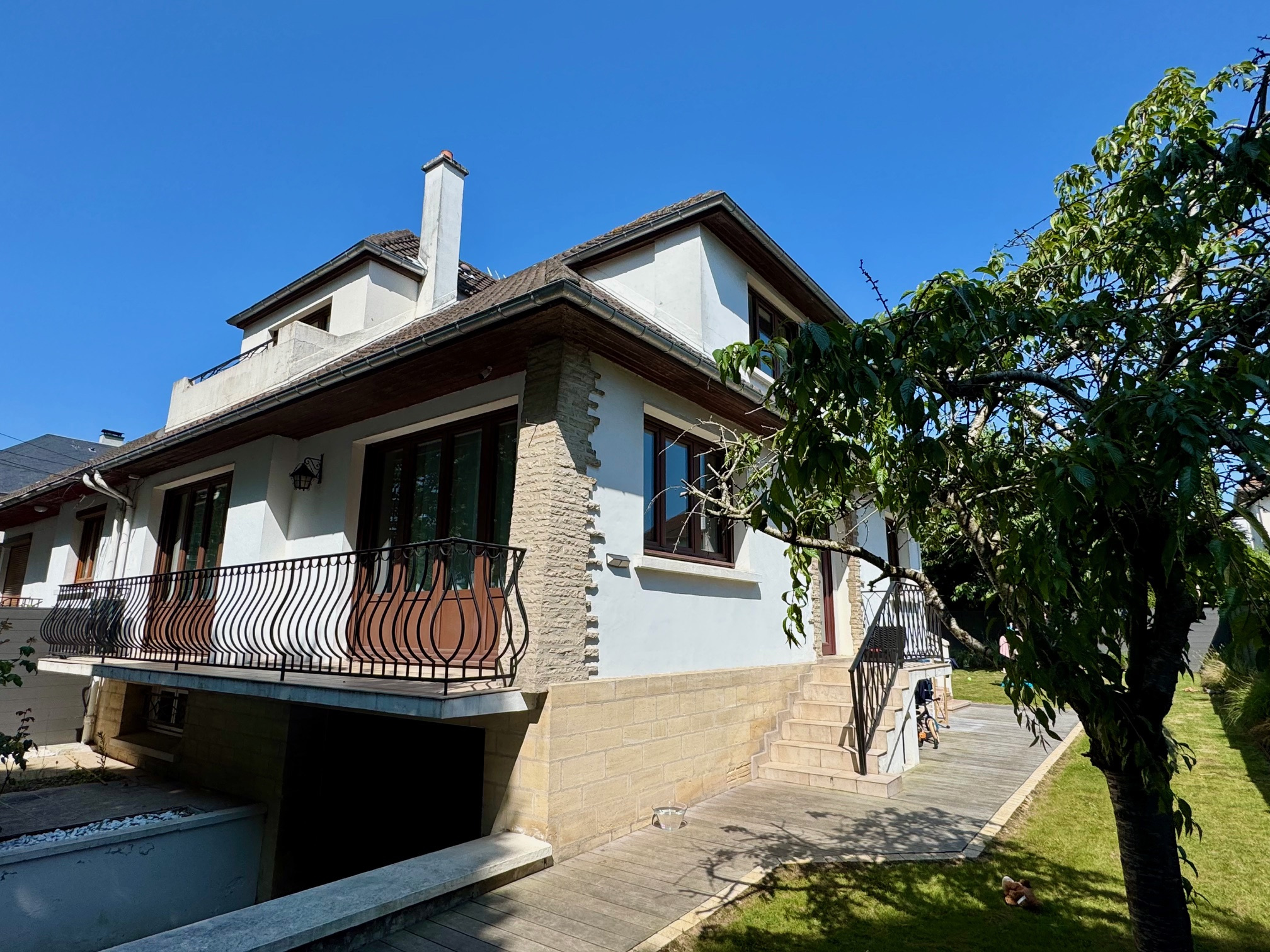 Le jardin clos et paysagé se trouve à l'opposé de le la rue, il est agrémenté d'une belle terrasse en bois exotique de 40m2 ensoléillée.