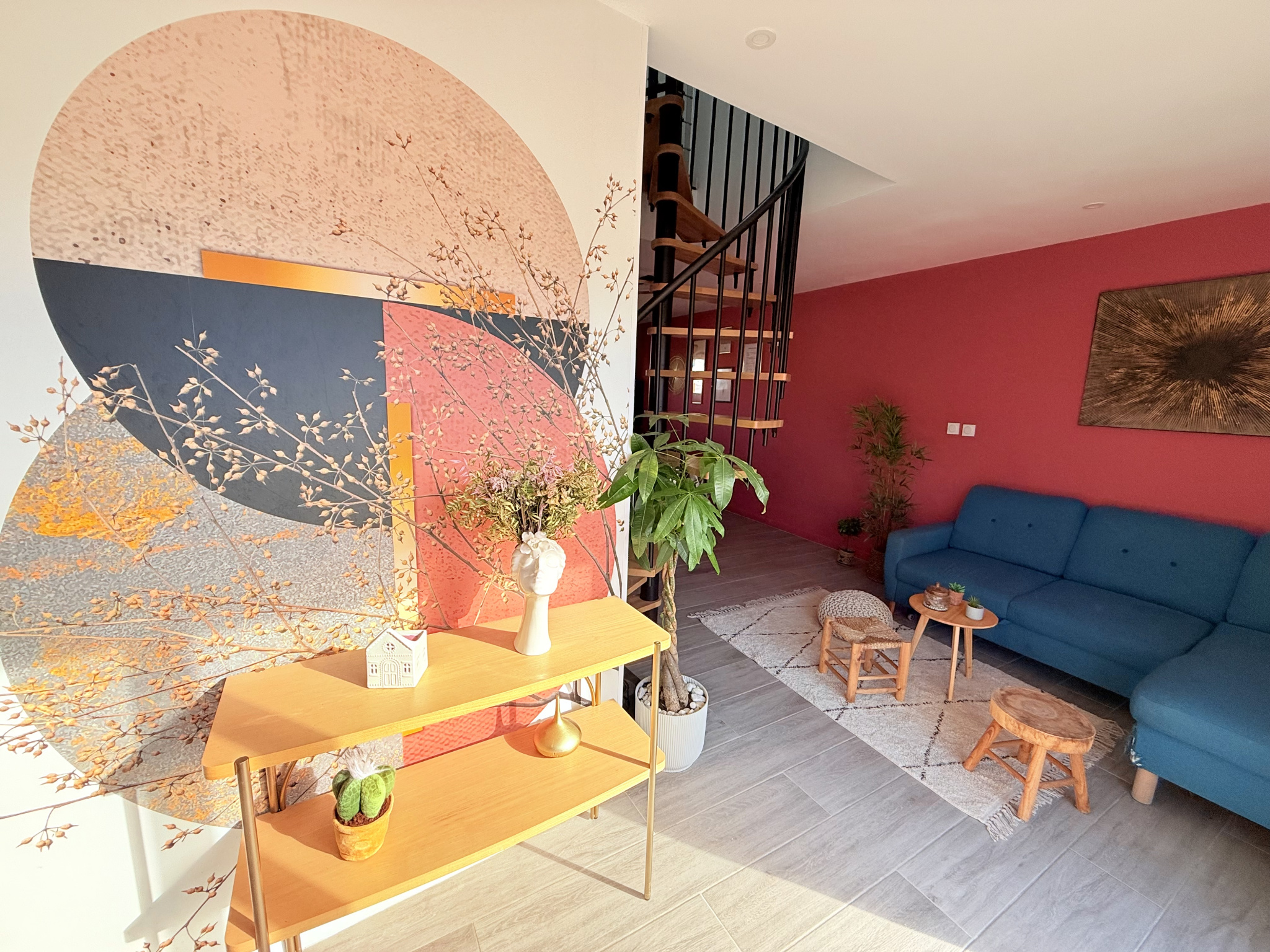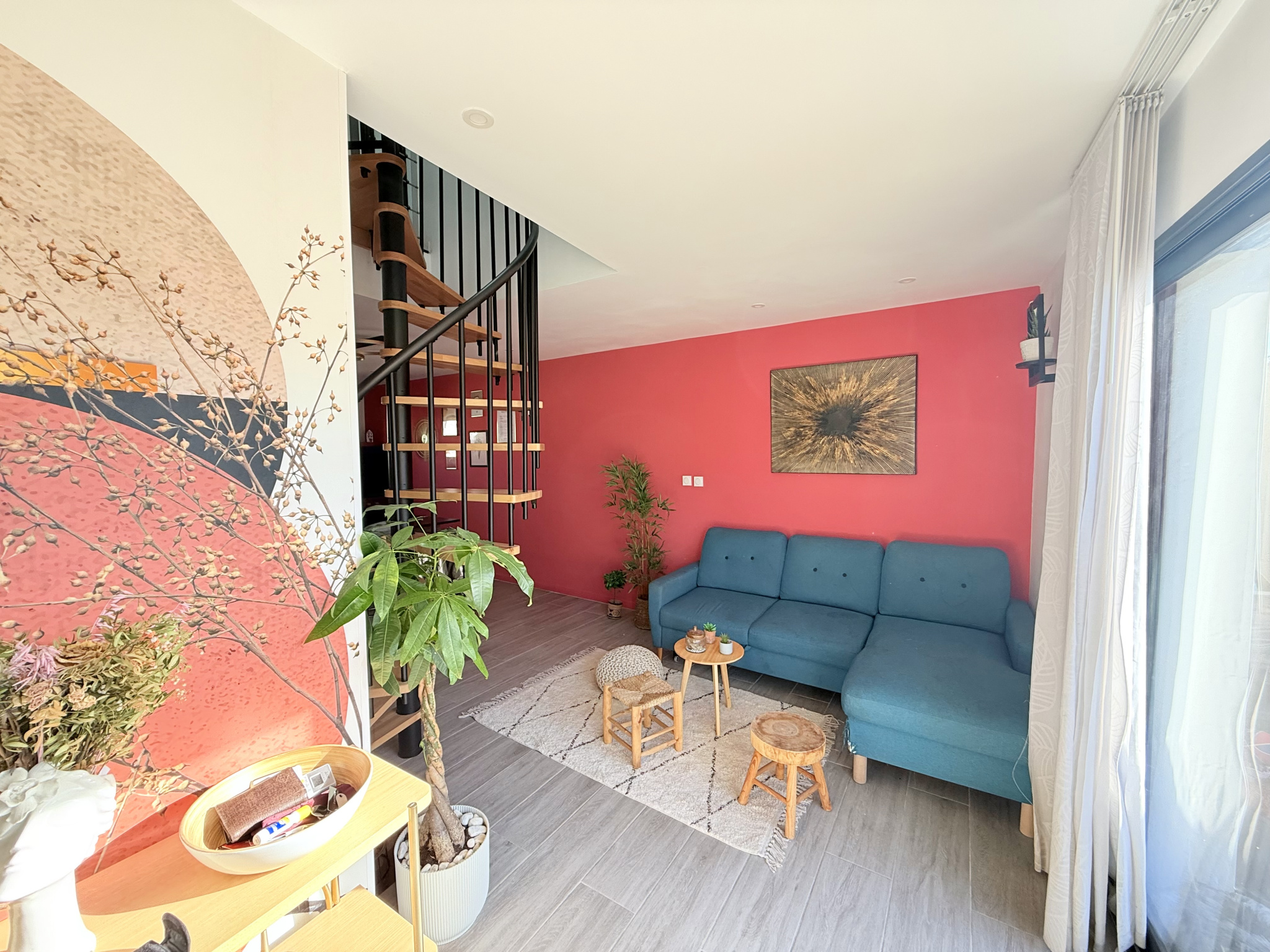 Un élégant escalier, en métal noir et bois, mène à l'étage, composé d'une suite parentale avec salle d'eau, deux grandes chambres avec placard, et une salle de bain moderne.