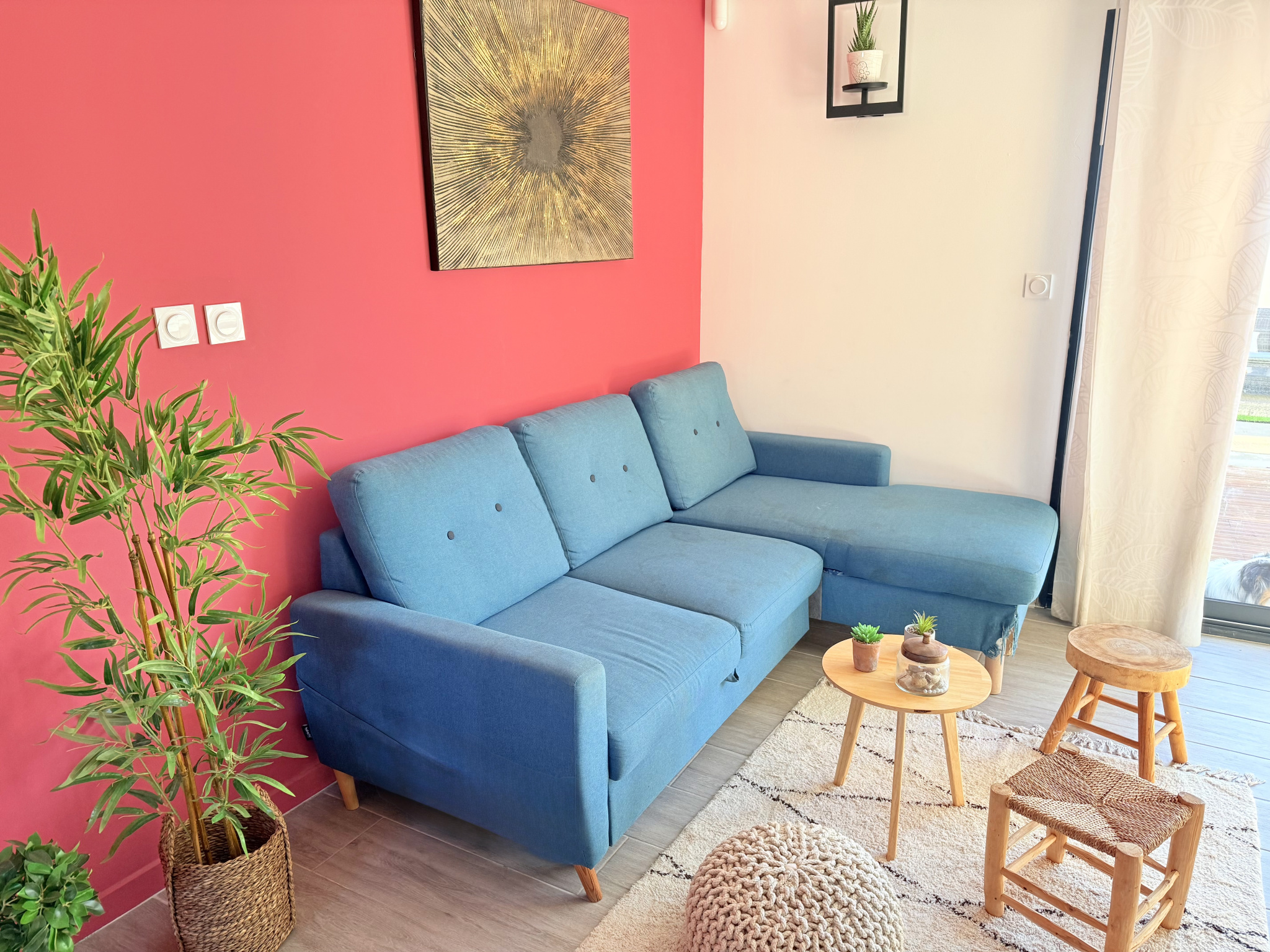 A l'extérieur, profitez d'un jardin avec grande terrasse en bois, orienté plein sud, parfait pour profiter des moments en famille ou entre amis.