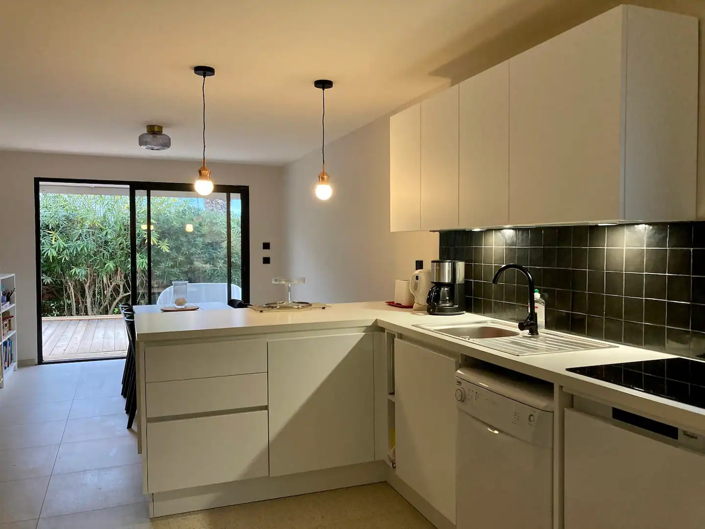 Un séjour avec cuisine ouverte, entièrement équipée et meublée (électroménager haut de gamme), offre un espace de vie convivial et chaleureux.Une chambre avec salle d'eau / WC bénéficie d'un accès direct à la maison et d'une entrée indépendante, parfaite pour recevoir ou envisager un espace locatif.