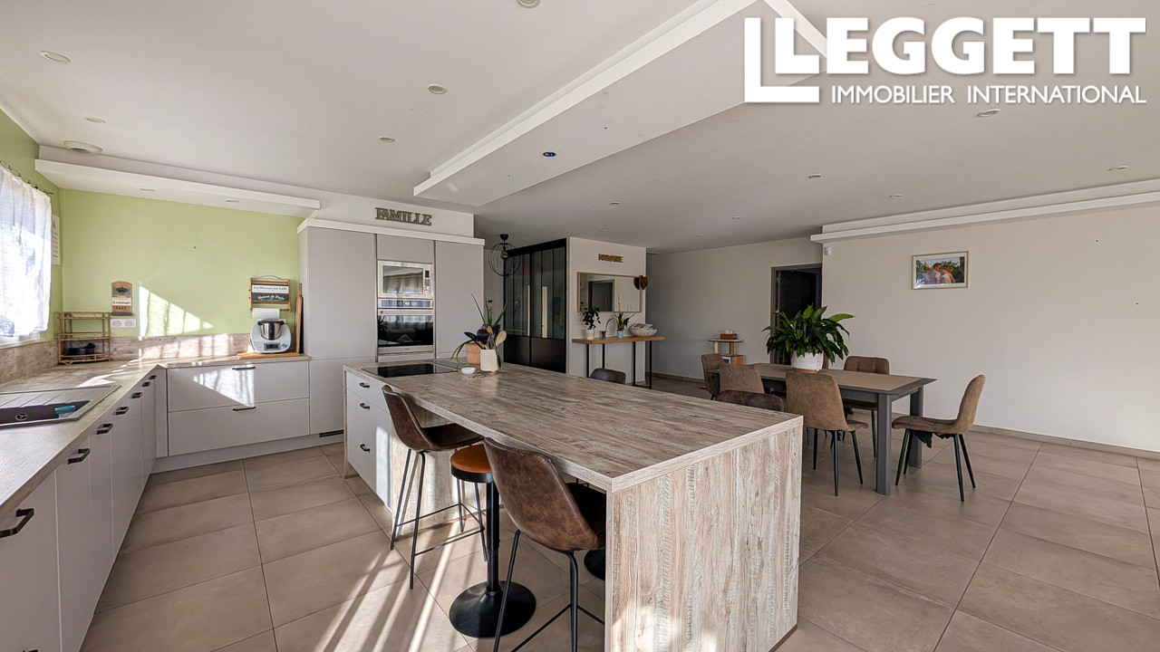 L'entrée avec placard et buanderie mène à la spacieuse pièce à vivre de 78m², avec sa cuisine équipée et son grand ilot pour cuisiner et dîner confortablement.