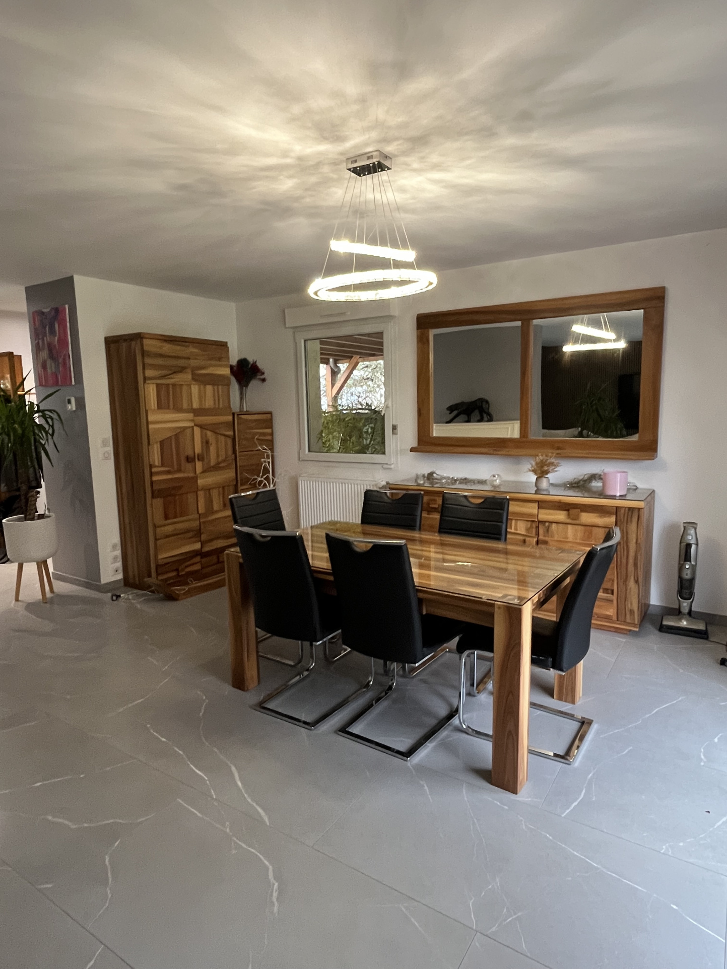 Bel espace de vie composé d'une cuisine ouverte entièrement équipée, d'une salle à manger conviviale et d'un salon particulièrement cosy. Le rdc accueille également une chambre avec sa salle d'eau, offrant une vraie autonomie ou un confort supplémentaire pour une vie de plain-pied. Les volumes, la luminosité et la qualité des finitions apportent une atmosphère douce et accueillante.