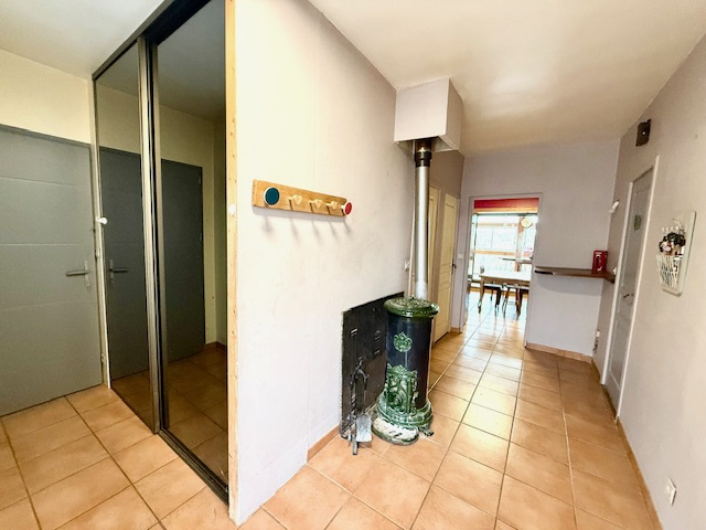 Vous profiterez d'un vaste salon chaleureux avec poêle à bois, d'une cuisine séparée donnant accès à une grande véranda lumineuse donnant sur l'extérieur, ainsi que de quatre chambres confortables à l'étage. La maison dispose également d'une salle de bain (à rénover) et d'une salle d'eau ainsi que 2 WC séparés.