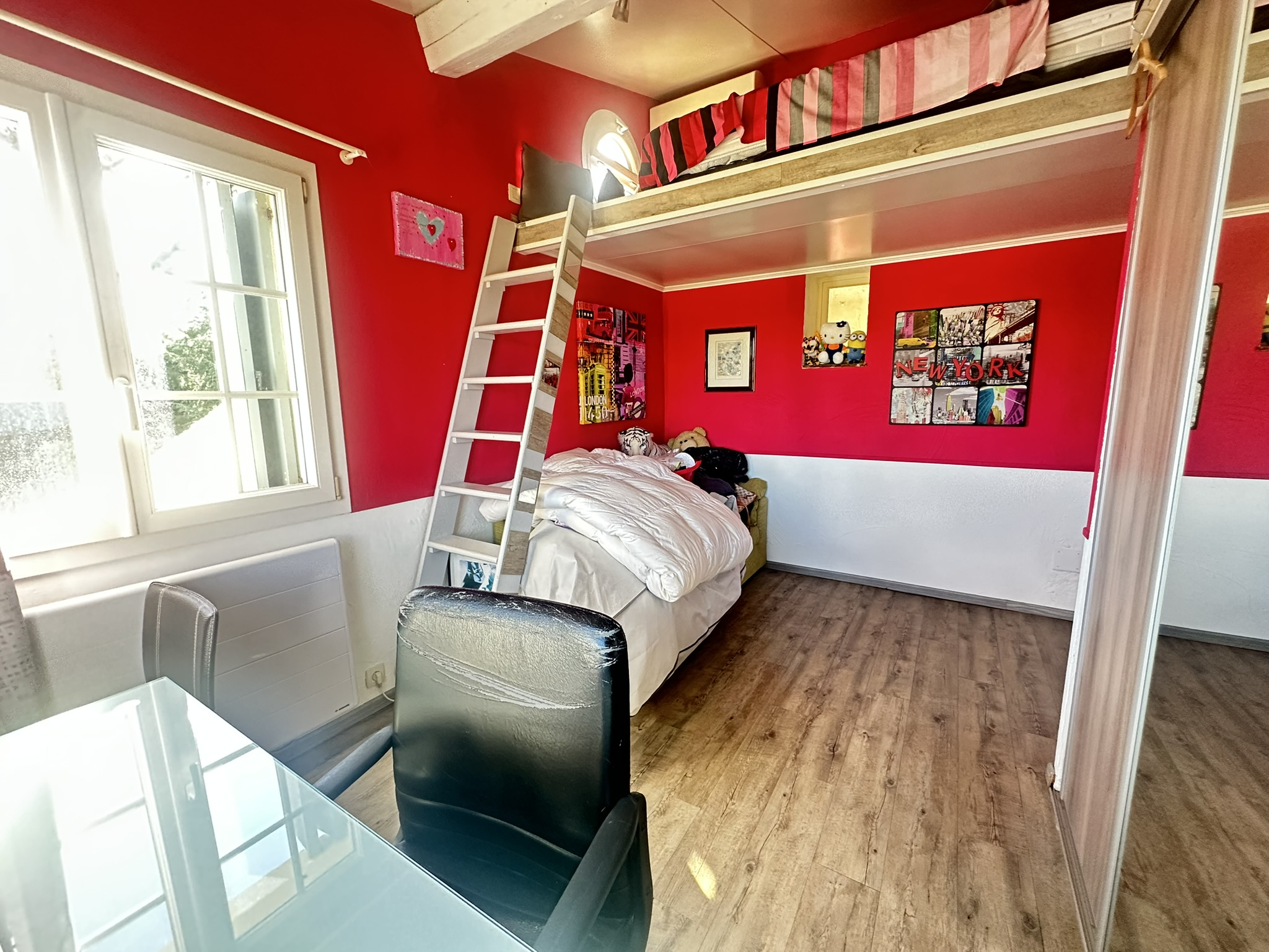 Au 1er étage: 3 chambres avec placards, dont 2 avec mezzanines - espace bureau donnant sur une terrasse - salle de douche ind.