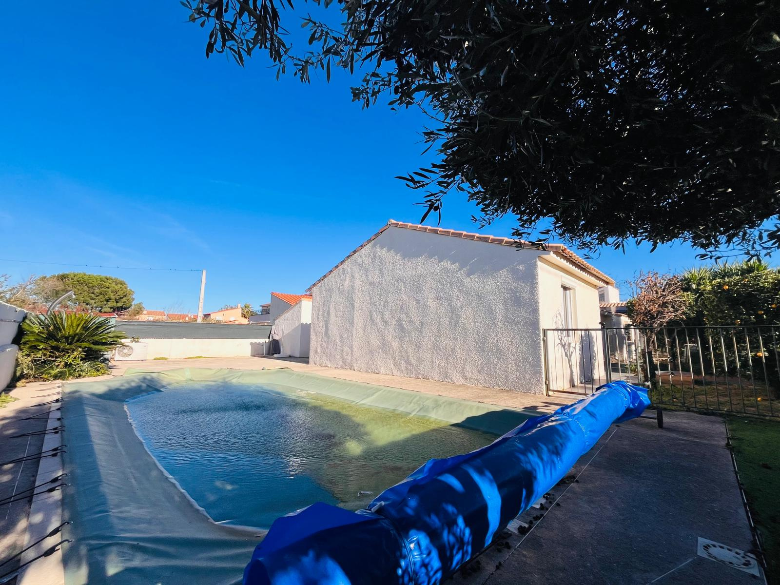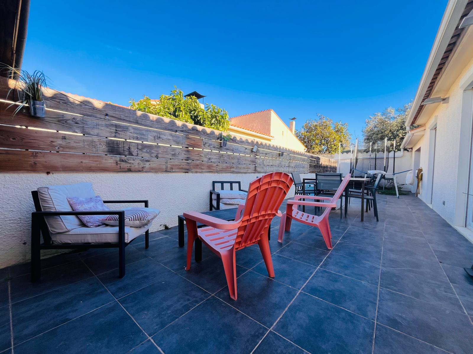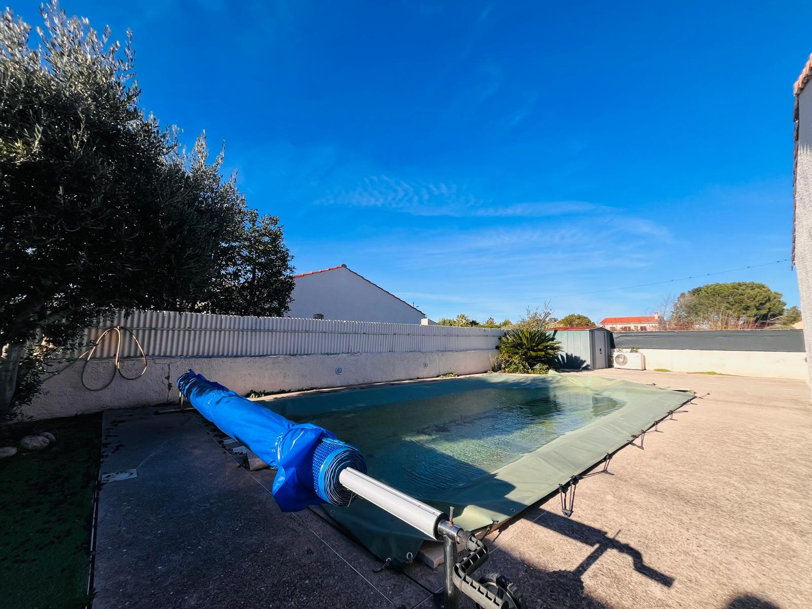 Les extérieurs offrent plusieurs espaces conviviaux avec terrasses carrelées, une piscine (8×4), une cuisine d'été, ainsi qu'un grand garage traversant et une place de stationnement.