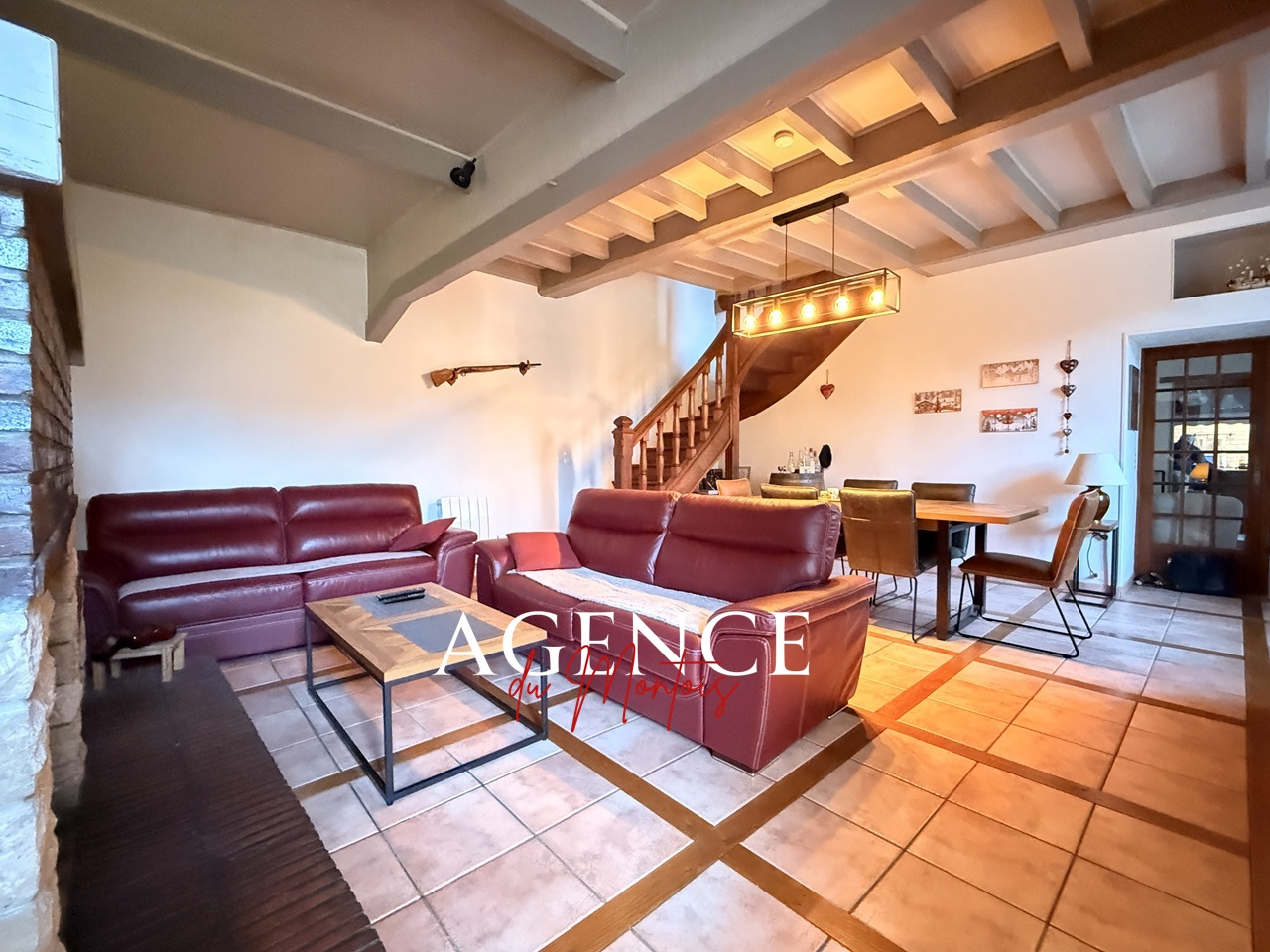 entrée, cuisine aménagée et équipée, séjour 35 m2 (cheminée avec insert), chambre avec wc et dressing, salle de bains, wc,