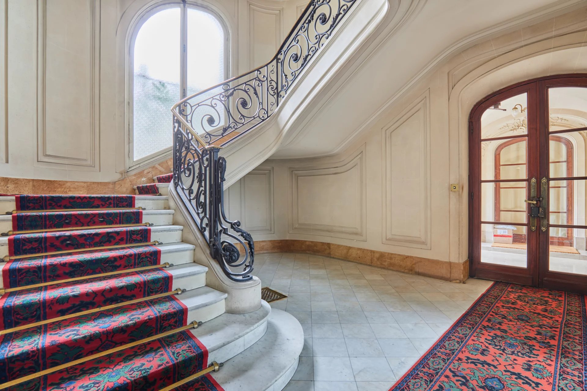Au sein d’un magnifique immeuble haussmannien, à deux pas de la rue de Lévis et du Parc Monceau, ce vaste appartement de 300 m² occupe le premier étage avec ascenseur. Traversant Est–Ouest, il bénéficie d’une circulation fluide et d’une luminosité généreuse tout au long de la journée.