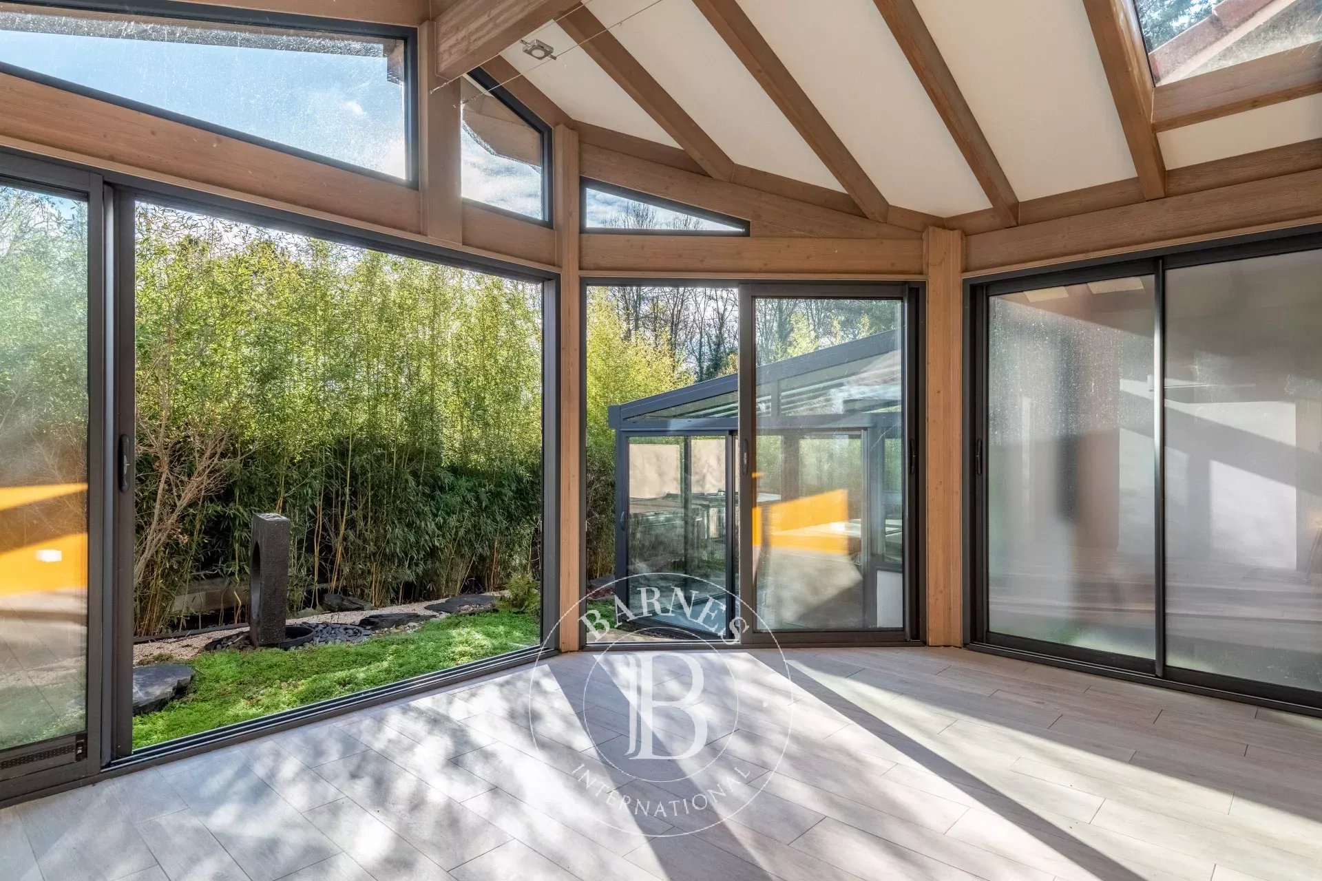 Une véranda climatisée prolonge l’ensemble et crée un espace détente privilégié avec vue sur un bassin paysager.