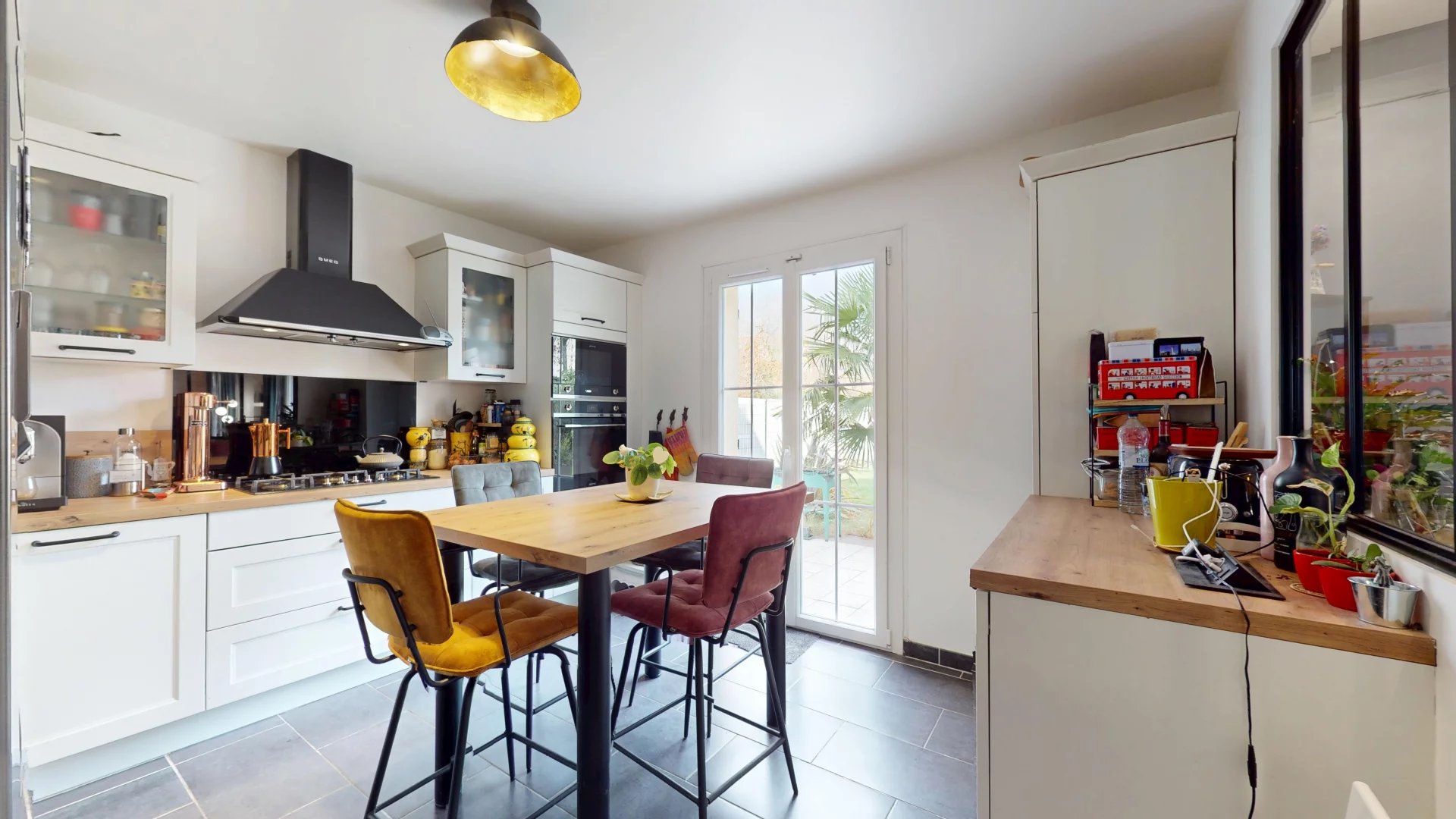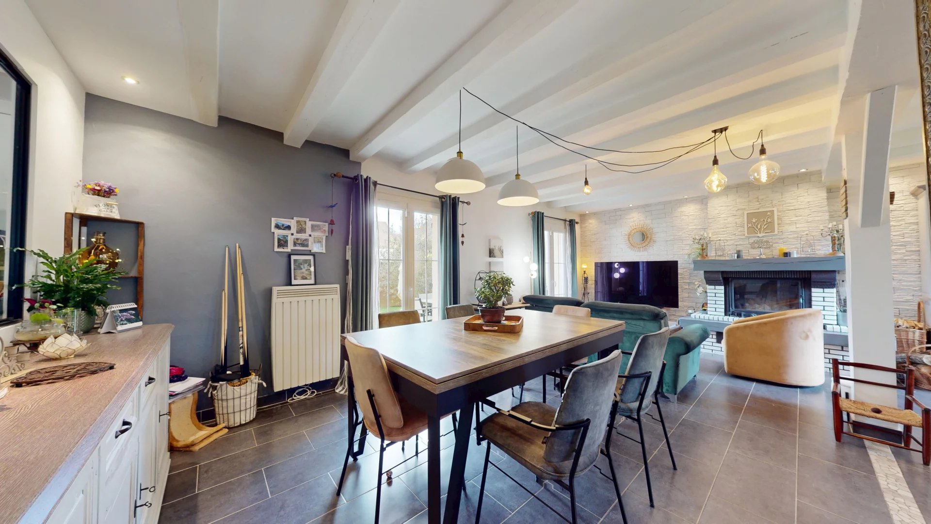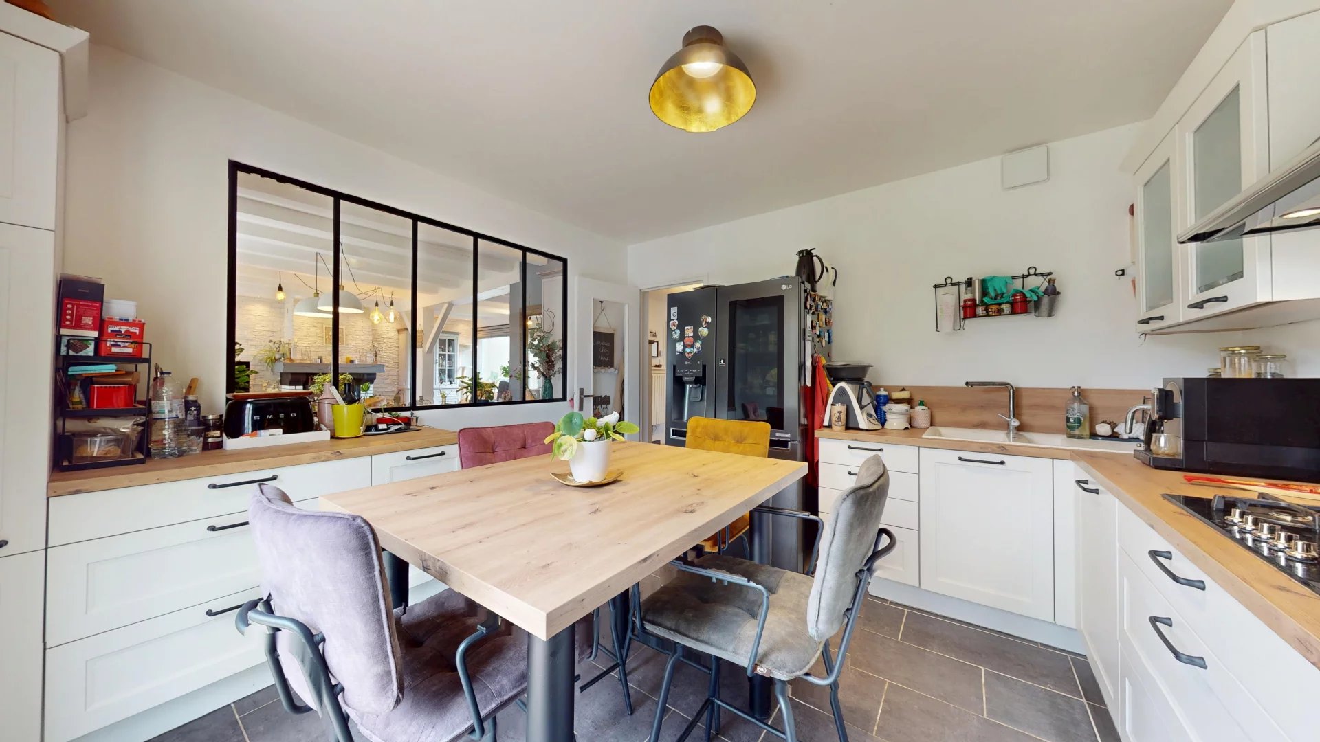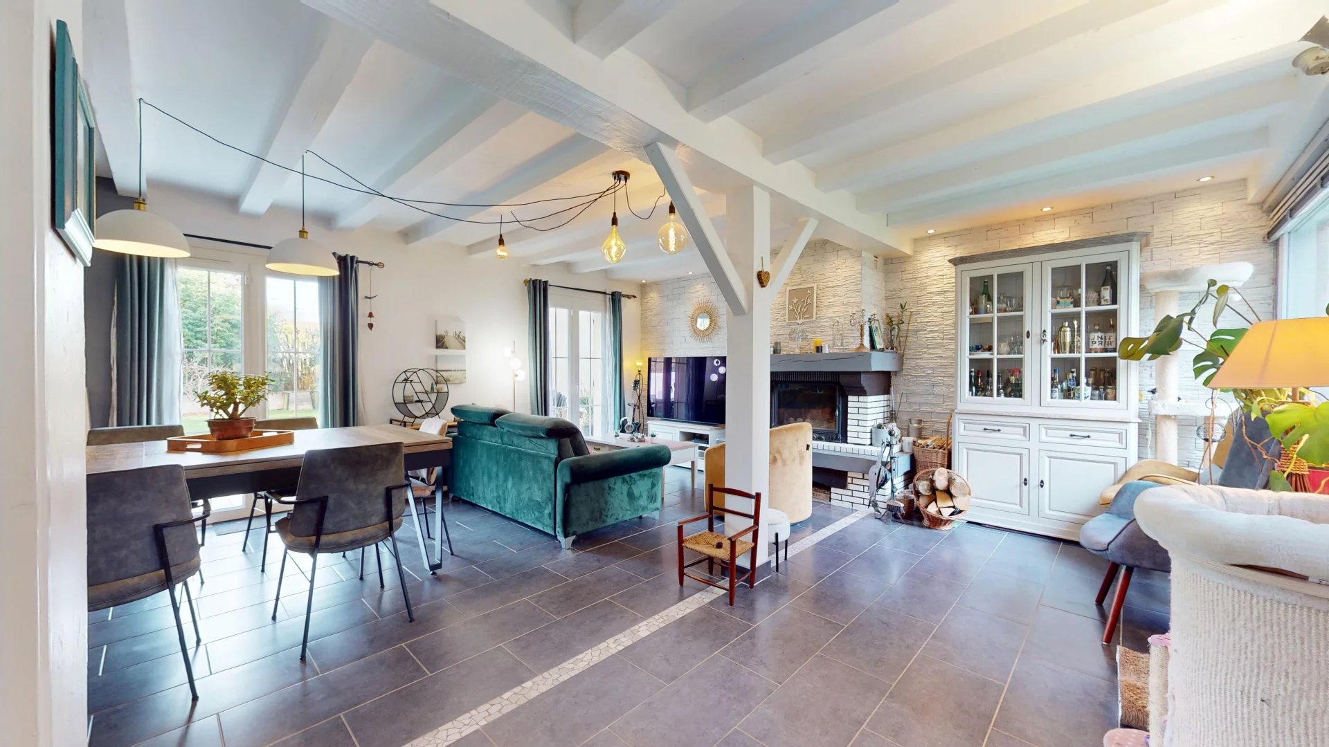 Dès l’entrée, un hall généreux de plus de 7 m² annonce les beaux volumes du rez-de-chaussée. Il dessert un vaste salon-séjour de 35 m² avec cheminée, baigné de lumière et ouvert sur une terrasse d’environ 35 m². Une verrière atelier sépare élégamment cet espace de la cuisine indépendante de près de 13 m², elle aussi prolongée par la terrasse, permettant une circulation fluide entre les pièces et l’extérieur.